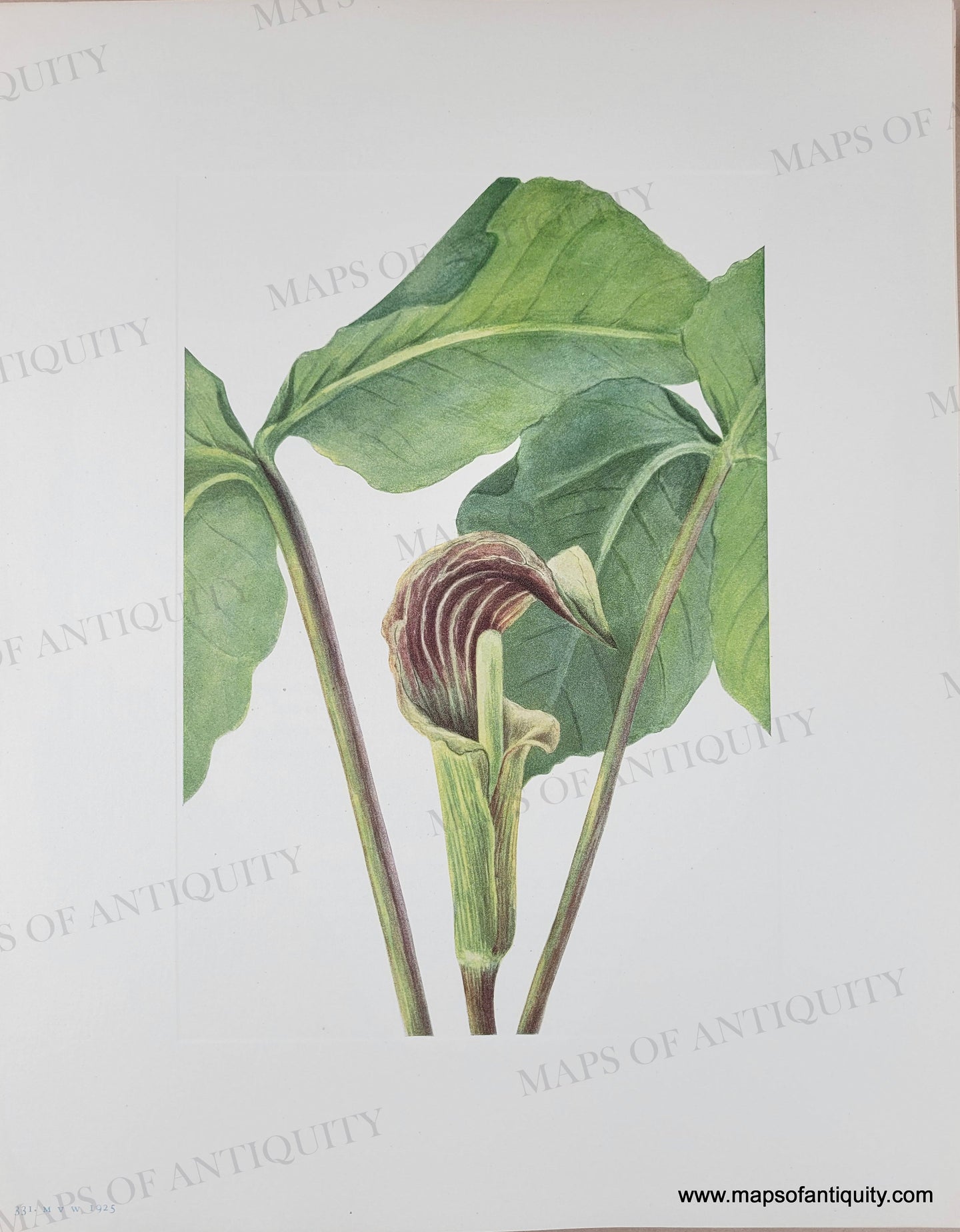 Antique botanical lithograph of Jack-in-the-Pulpit. Arisaema triphyllum (Linnaeus) Torrey from North American Wild Flowers by Mary Vaux Walcott, published by the Smithsonian Institute, 1925. The cover booklet states: All sketches are life size. Each print is accompanied by a page with text describing the plant. Gorgeous original lithograph color. With plate mark. Page measures approx. 14 x 11 inches.