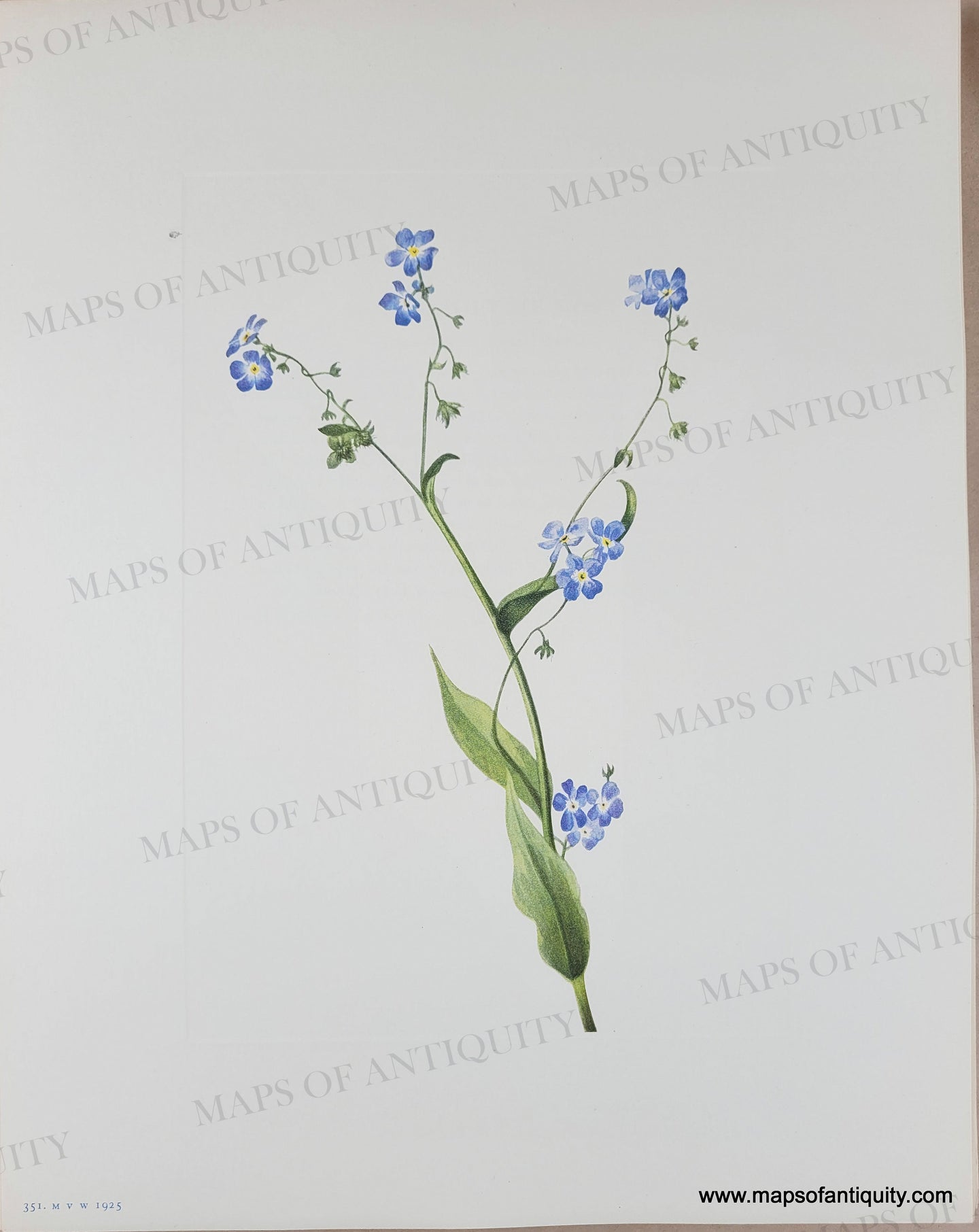 Antique botanical lithograph of Bur-forget-me-not. Lappula diffusa (Lehmann) Greene from North American Wild Flowers by Mary Vaux Walcott, published by the Smithsonian Institute, 1925. The cover booklet states: All sketches are life size. Each print is accompanied by a page with text describing the plant. Gorgeous original lithograph color. With plate mark. Page measures approx. 14 x 11 inches.