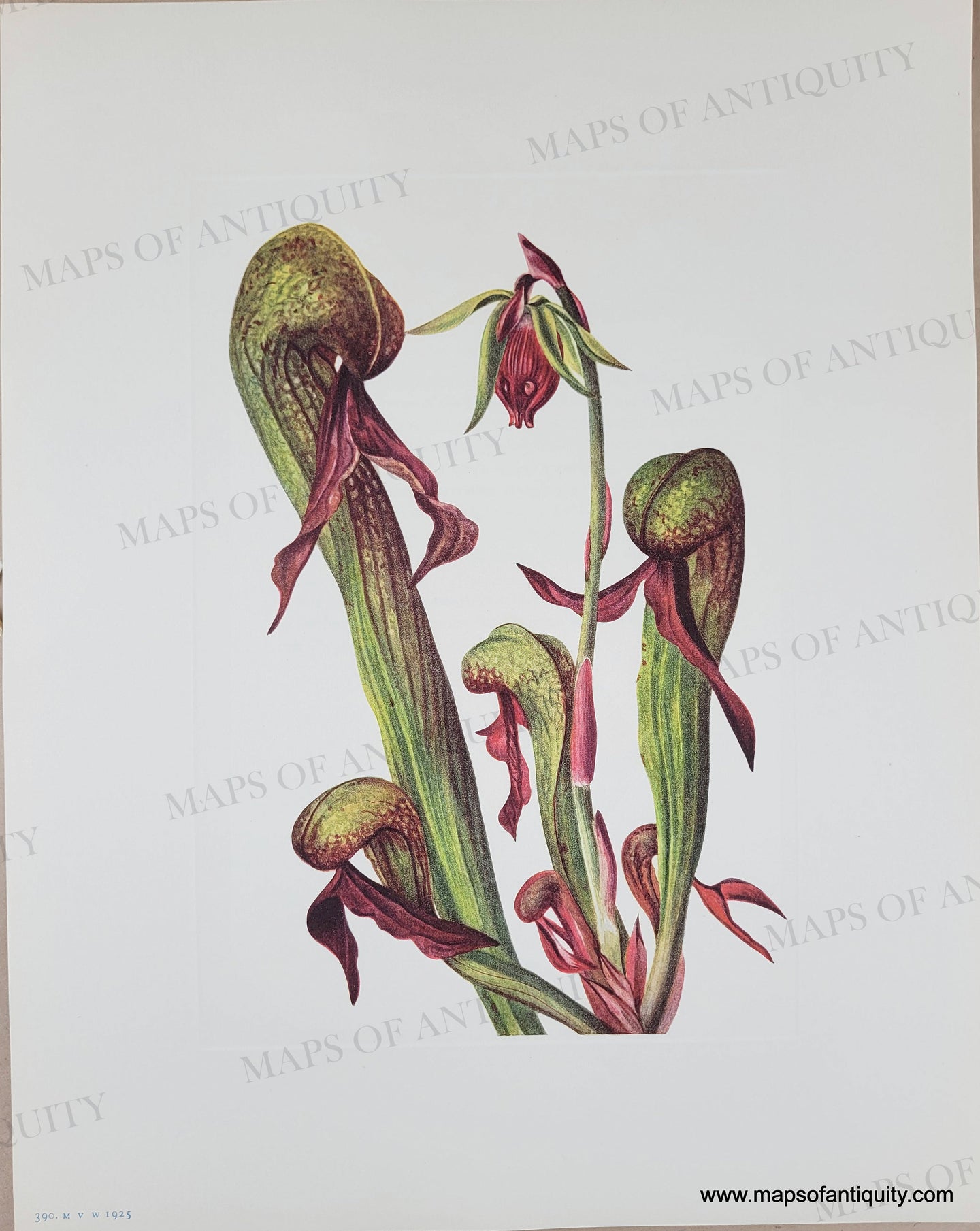 Antique botanical lithograph of California Pitcherplant. Chryamphora californica (Torrey) Greene from North American Wild Flowers by Mary Vaux Walcott, published by the Smithsonian Institute, 1925. The cover booklet states: All sketches are life size. Each print is accompanied by a page with text describing the plant. Gorgeous original lithograph color. With plate mark. Page measures approx. 14 x 11 inches.