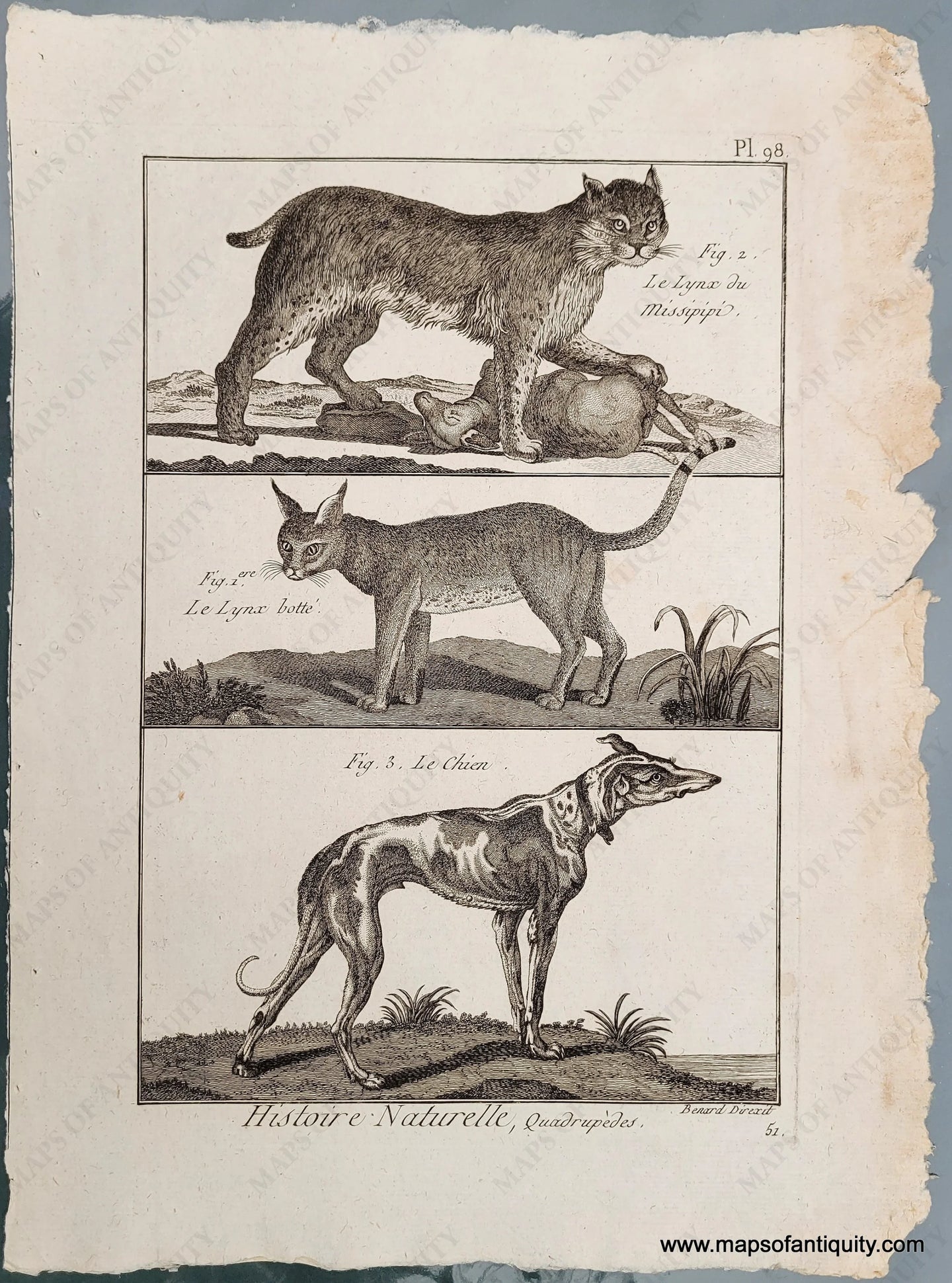 Antique copperplate engraving by Benard Direxit, from Encyclopédie méthodique - Histoire naturelle, Quadrupèdes, c. 1800. The titles of the animals translate to: Mississippi lynx, boot lynx, dog. Very good condition with obvious signs of age at the paper edges but few if any issues within the print. . Measures approx. 8.75 x 6.5 inches to the neatline.