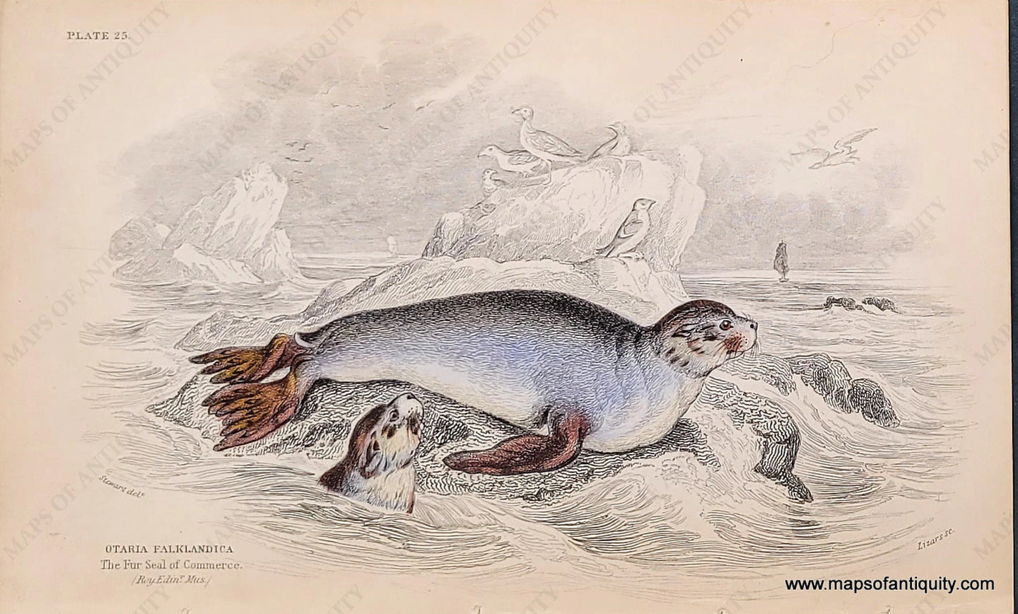 Antique hand colored illustration of fur seals, by William Jardine, in his work "Naturalist's Library," c. 1840. Very good overall antique condition with some toning and very mild wrinkling of the paper. Page measures approximately 4.25" x 6.75" in total.