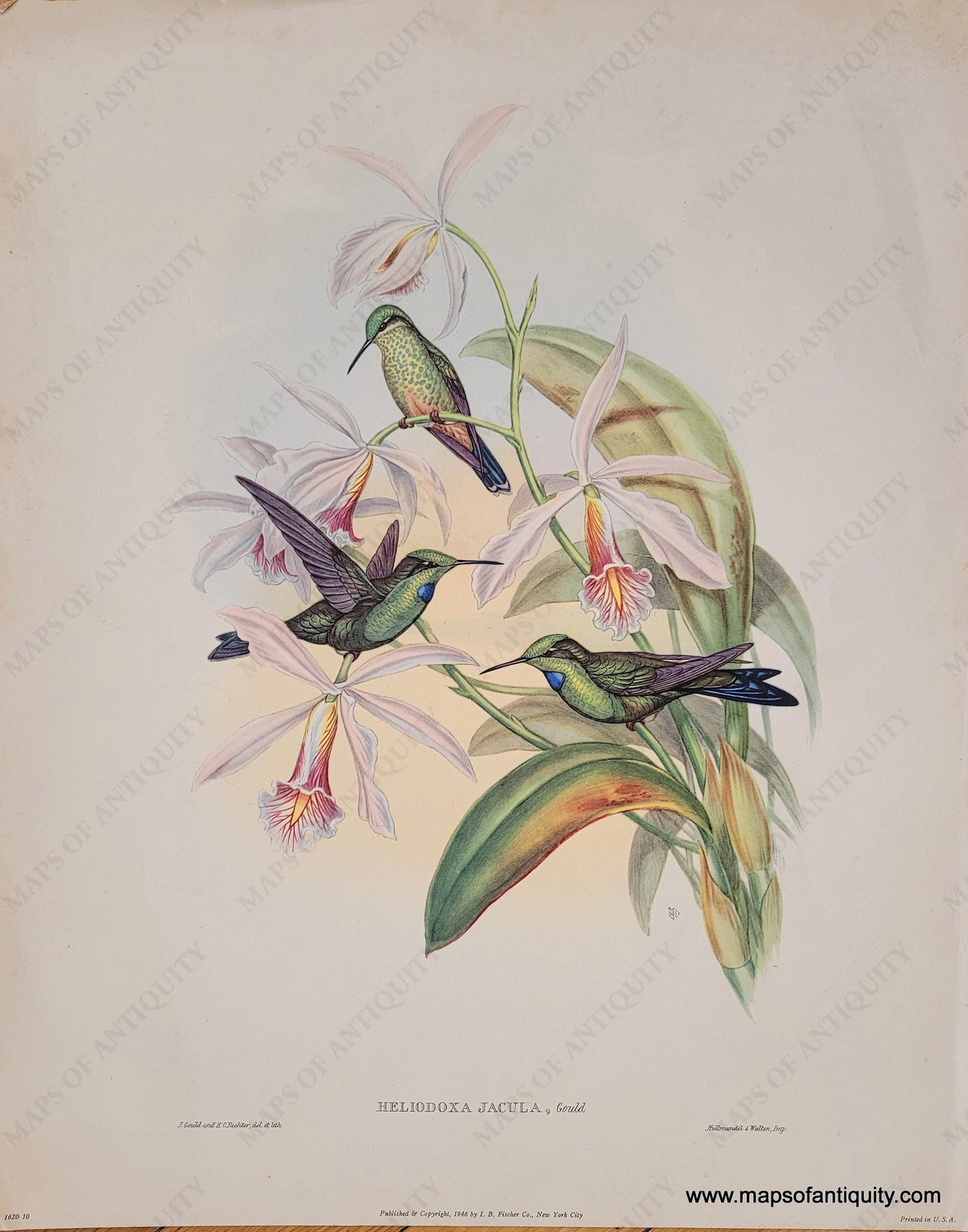 Antique print of hummingbirds, published and copyright 1946 by I.B. Fischer Co. Gorgeous rich color brings these hummingbirds and flowers to life. Very good condition with minor spots/surface soil. Measures approx. 20 x 16 inches to the paper edges.