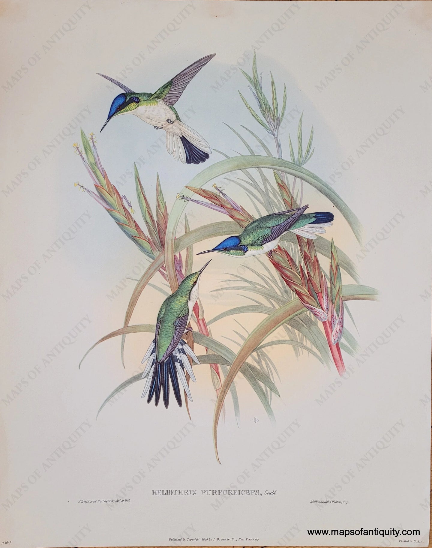 Antique print of hummingbirds, published and copyright 1946 by I.B. Fischer Co. Gorgeous rich color brings these hummingbirds and flowers to life. Very good condition with minor spots/surface soil. Measures approx. 20 x 16 inches to the paper edges.