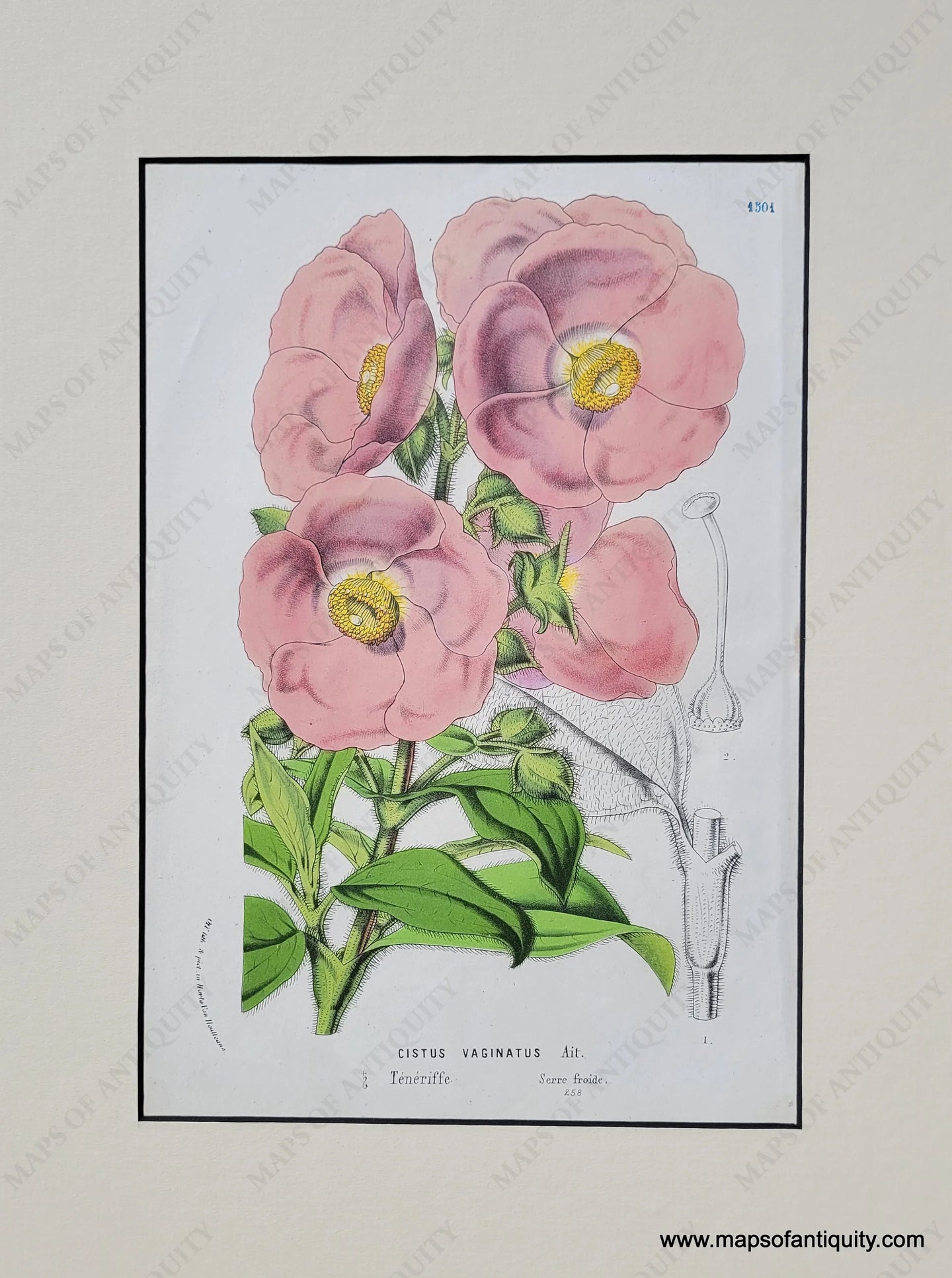 Antique print of a Rockrose, Cistus symphytifolius, from Flore des serres et des Jardins de l'Europe, c. 1850. Vivid original coloring. Matted. Very good antique condition. Measures approx. 14 x 11 to the outer edges of the mat.