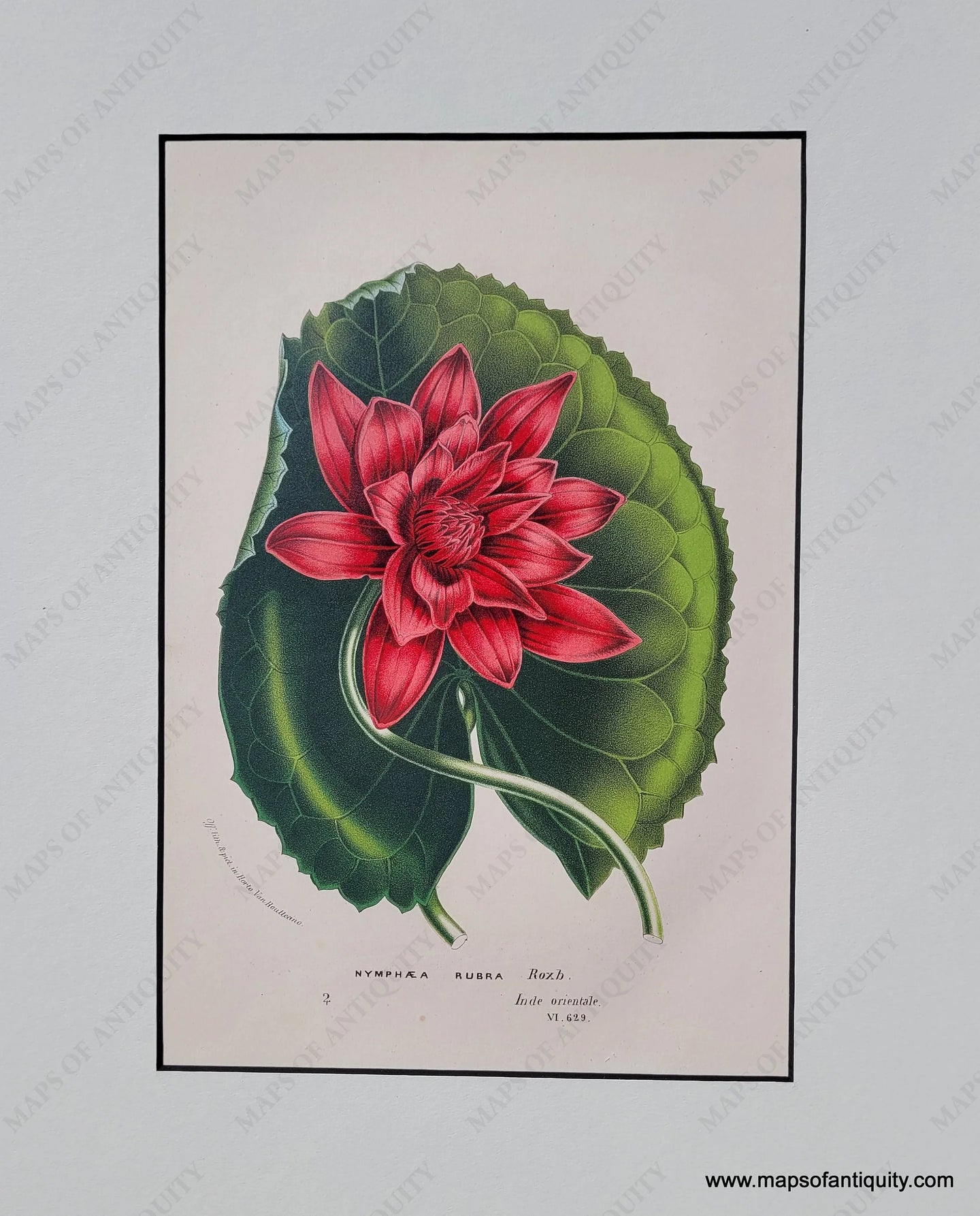 Antique print of a Water lily, Nymphaea Rubra, from Flore des serres et des Jardins de l'Europe, c. 1850. Vivid original coloring. Matted. Very good antique condition. Measures approx. 14 x 11 to the outer edges of the mat.