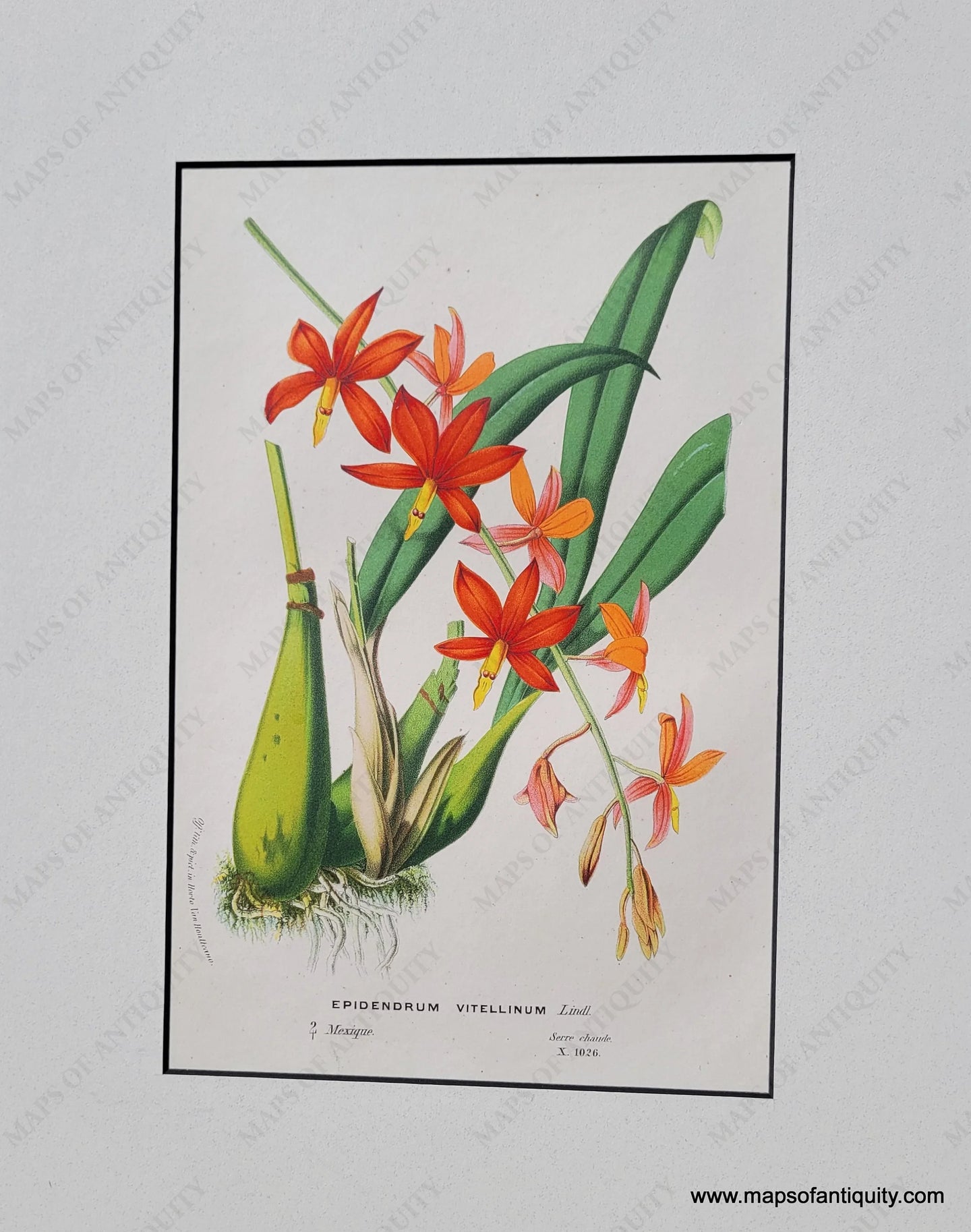 Antique print of an Orchid, Epidendrum vitellinum (Prosthechea vitellina), from Flore des serres et des Jardins de l'Europe, c. 1850. Vivid original coloring. Matted. Very good antique condition. Measures approx. 14 x 11 to the outer edges of the mat.