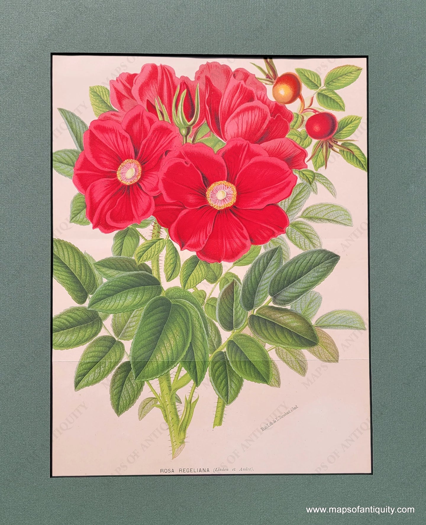 Antique print of a wild rose, Rosa rugosa Thunb., from L'Illustration Horticole, c. 1870. Vivid original coloring. Matted. Very good antique condition. Measures approx. 17 x 14 to the outer edges of the mat.
