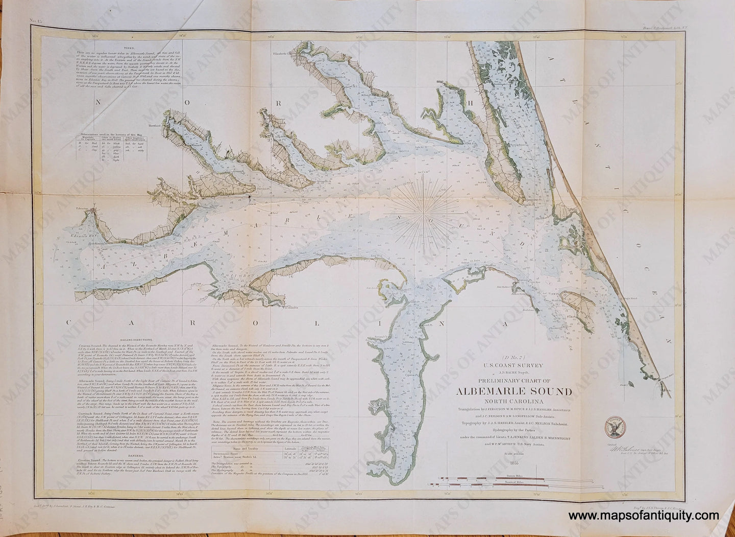 Antique coast survey of Albemarle Sound, NC, by the US Coast Survey, 1855. Part of the greater Outer Banks regions, this chart includes Elizabeth City, Edenton, Nags Head, Roanoke Island, and Kitty Hawk. Includes water depths, lightships, sailing directions, and information about the tides. Very good antique condition with some mild toning, a wrinkle in upper left, some very mild foxing/tiny spots. Small separations at fold intersections. Hand-colored by our professional colorist. Measures approx. 15.25 x 21.25 inches to the neatline.