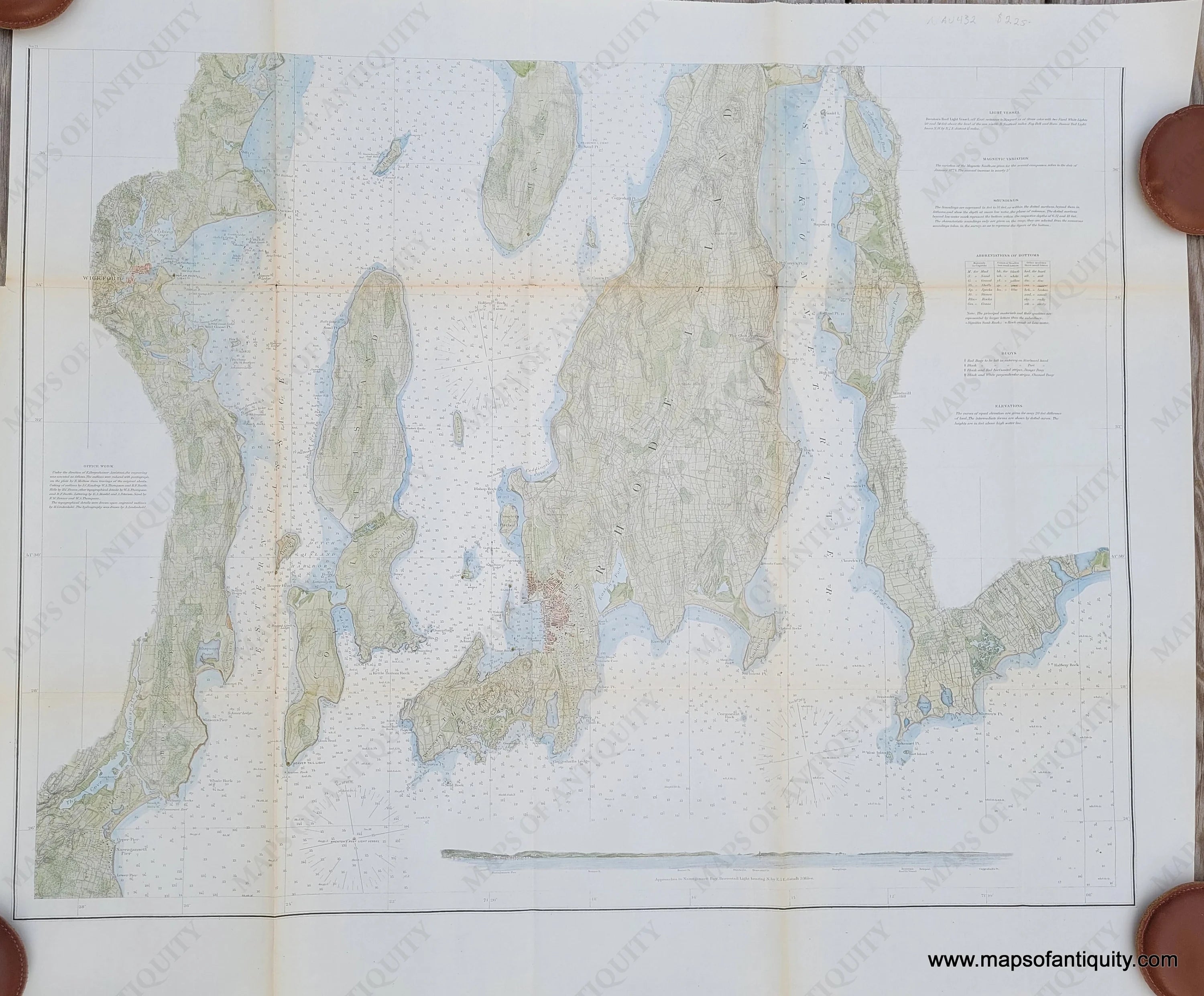 Antique coast survey of part of Narragansett Bay, by the US Coast Survey, 1873. Hand-colored by a professional colorist. This is the southern half of a two-part chart and it includes Newport, Jamestown, Little Compton, Wickford in North Kingstown, Portsmouth, and more. With information on light vessels, soundings, ocean floor material, bouys, etc. Very finely detailed color, with a recognition profile showing the entrance of Narragansett Bay. Very good antique condition, with minor toning, slight wrinkles, tiny separations at fold intersections. Measures approx. 23.5 x 30 inches.
