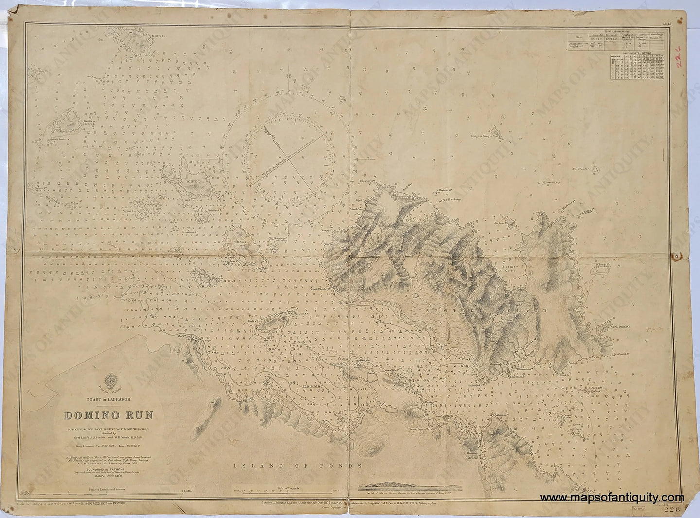 Antique nautical chart of Domino Run on the coast of Labrador, by the British Admiralty Hydrographic Office, first published in 1875 and corrected up to 1941. Domino Run is a rapids in Newfoundland and Labrador, it is situated between Island of Ponds and Spotted Island, Newfoundland and Labrador. With water depths and some topography. Fair condition with toning, wear along the folds and paper edges, some spots and stains. Measures approx. 19 x 26 inches to the neatline.