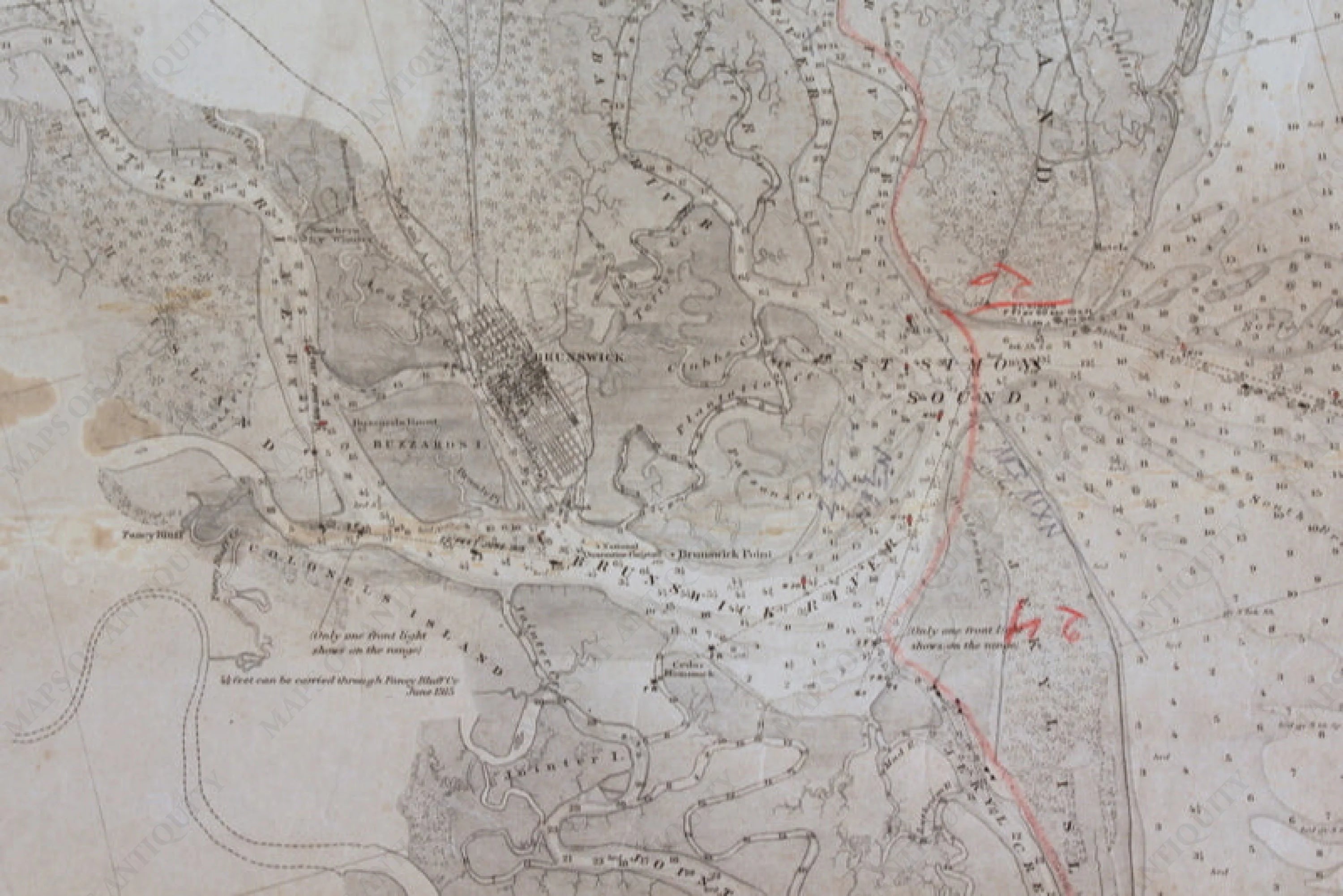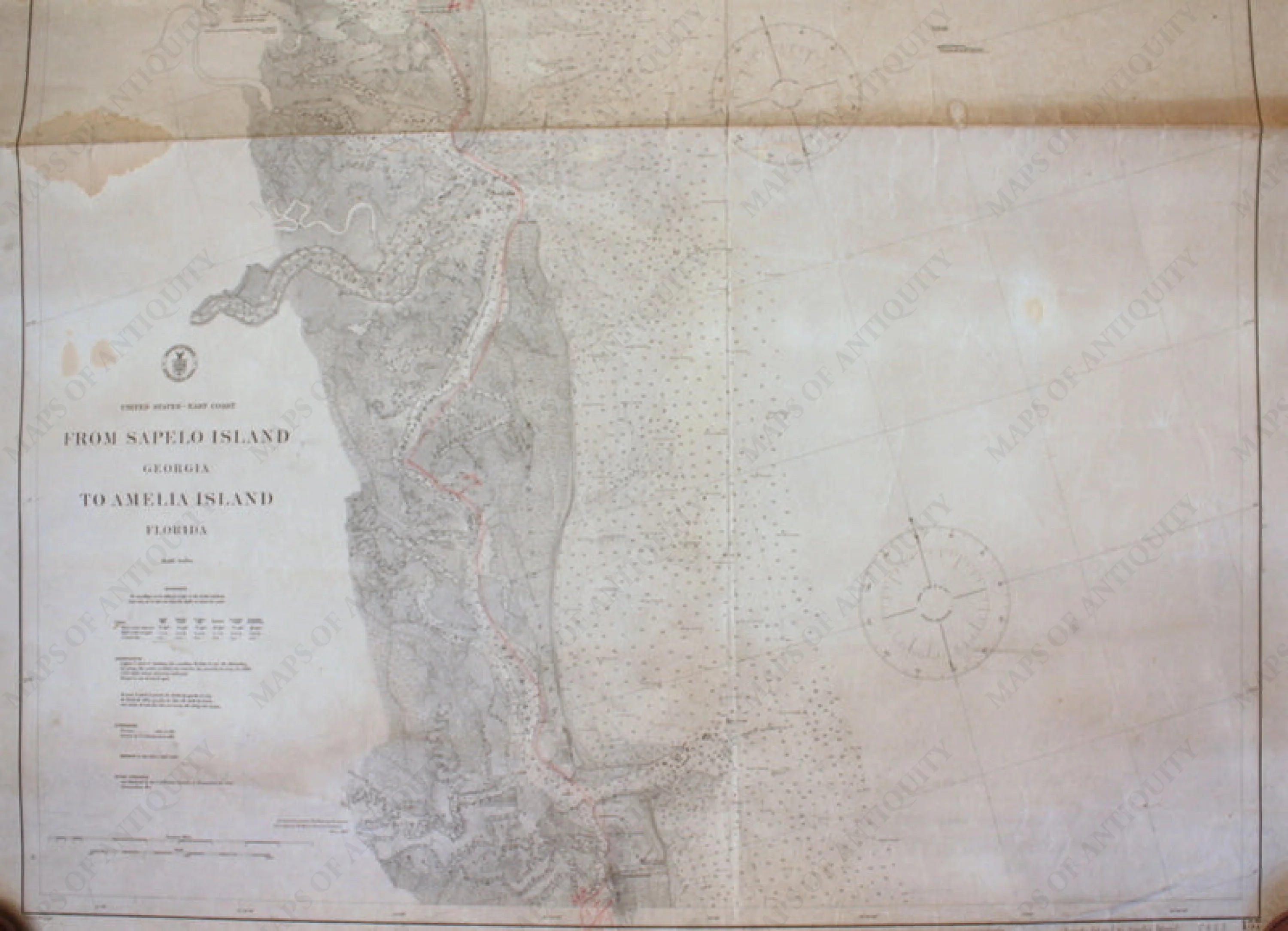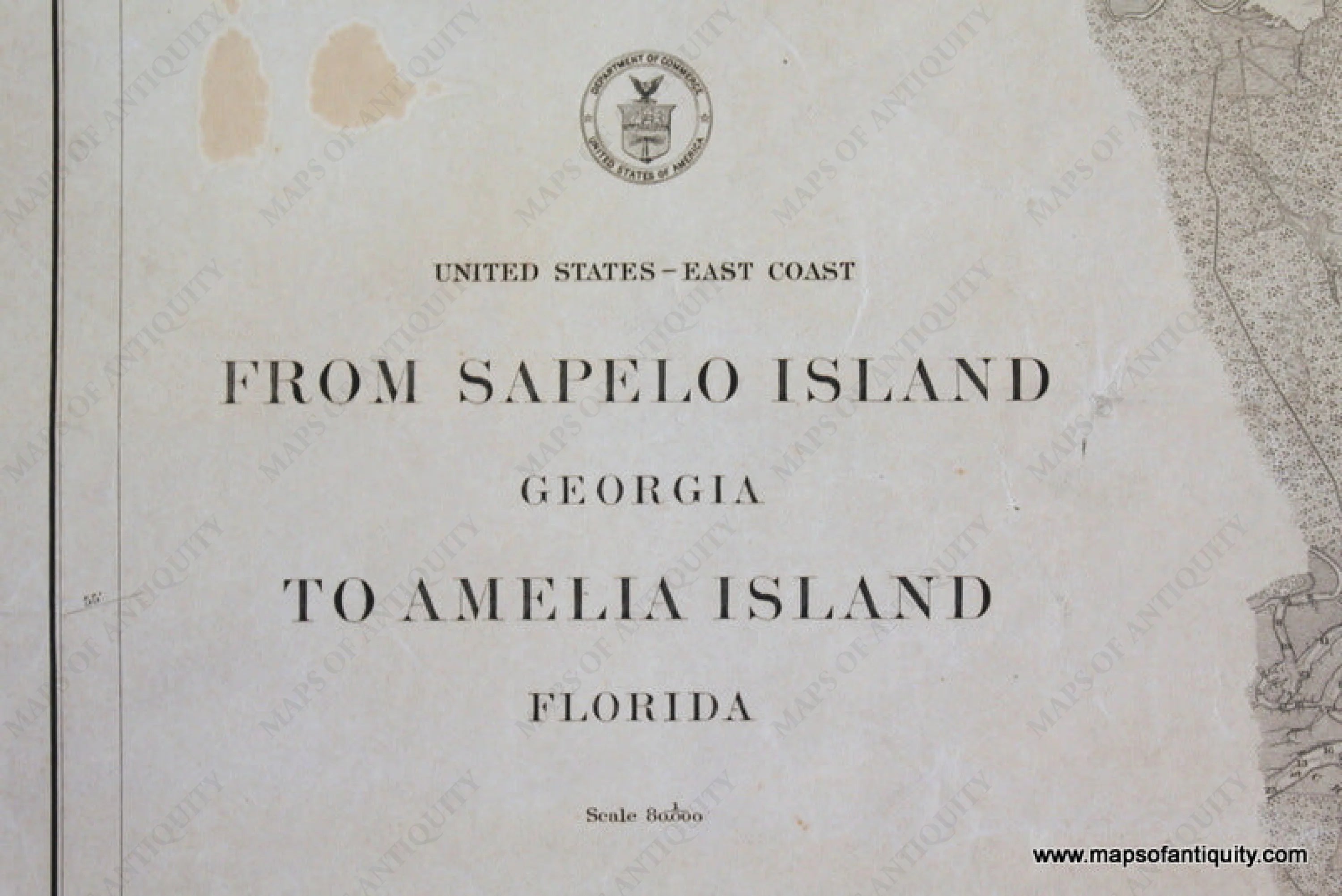 Black and white antique nautical chart, shows the area around Brunswick from Fernandina Beach on Amelia Island in Florida to Sapelo Island off the coast of Georgia with detailed bathymetric data. Poor condition, toned, center fold, wear to edges, staining, plotting marks, approximatley 41" x 32" to the neat lines