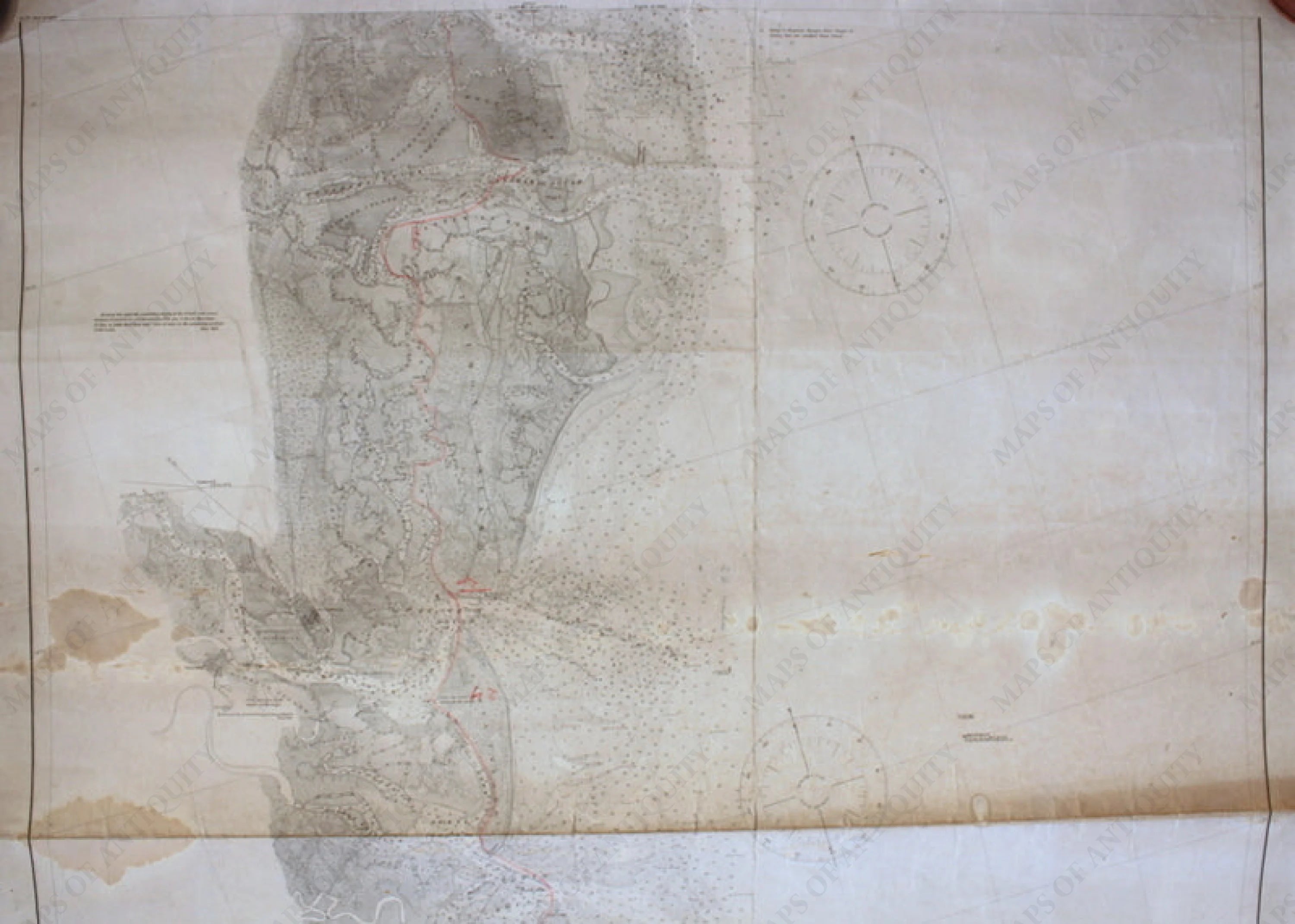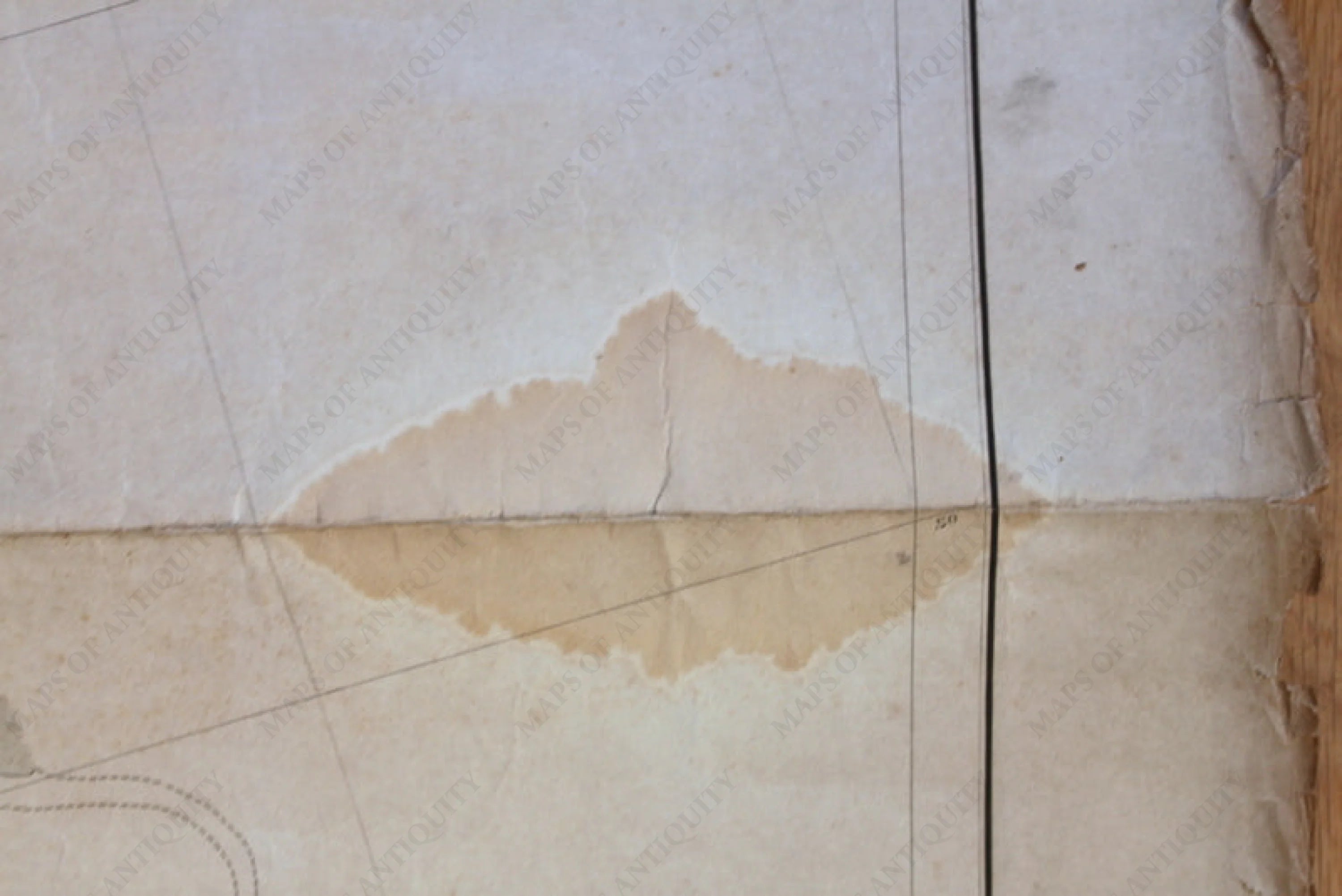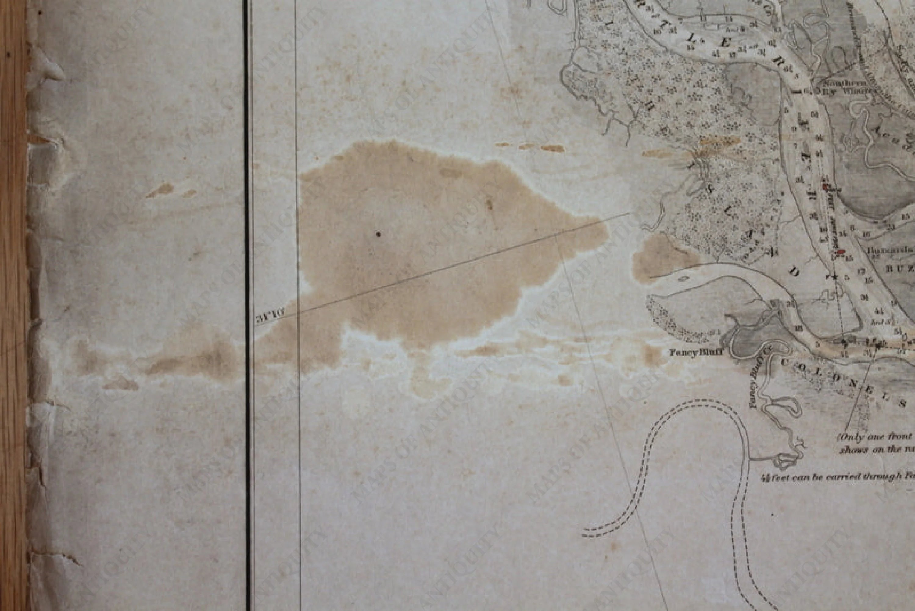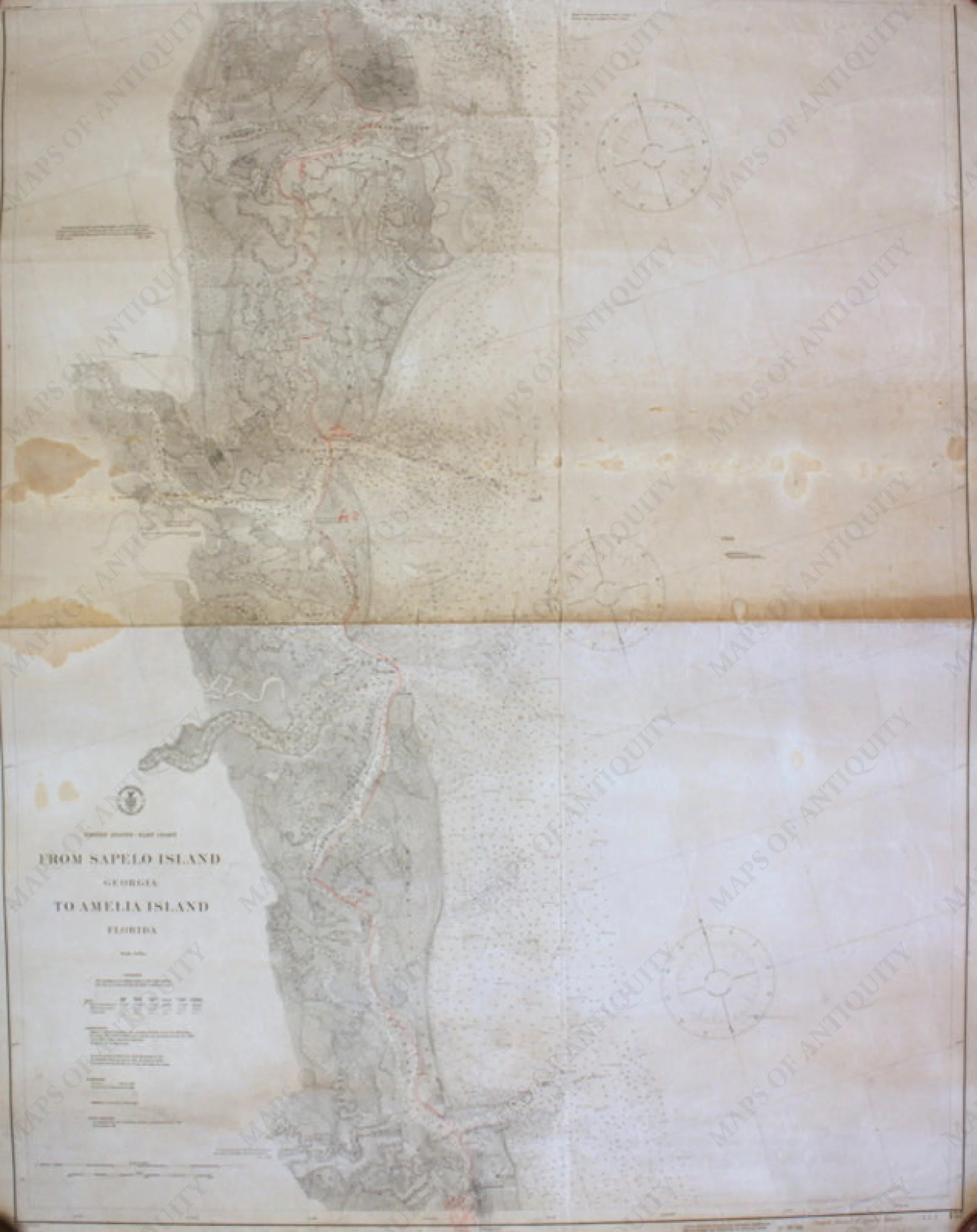 Black and white antique nautical chart, shows the area around Brunswick from Fernandina Beach on Amelia Island in Florida to Sapelo Island off the coast of Georgia with detailed bathymetric data. Poor condition, toned, center fold, wear to edges, staining, plotting marks, approximatley 41" x 32" to the neat lines