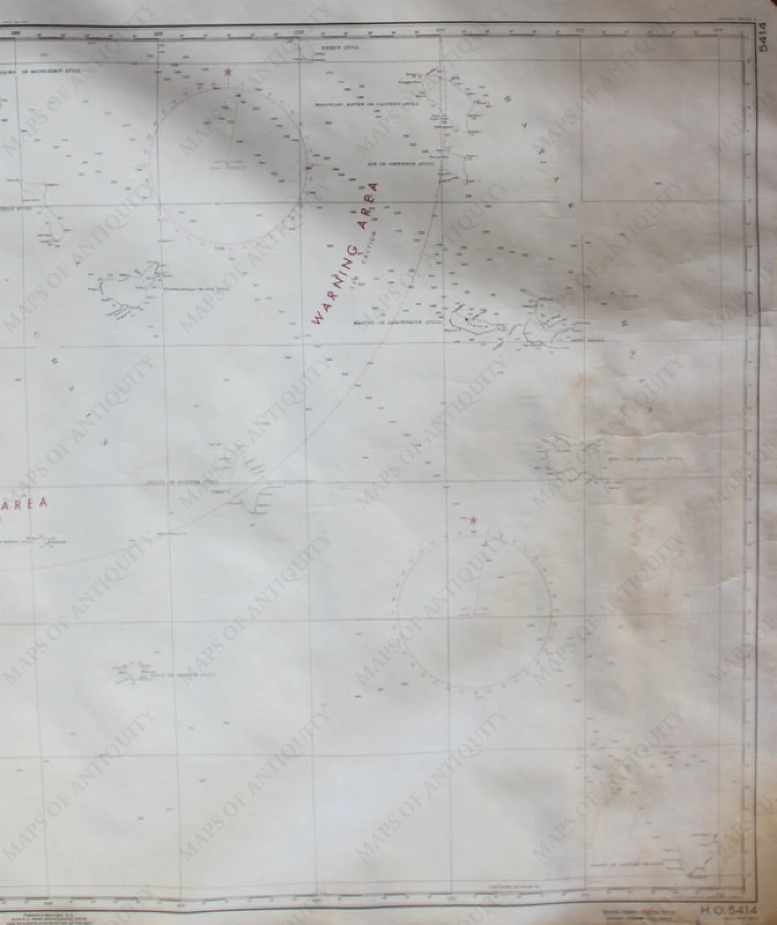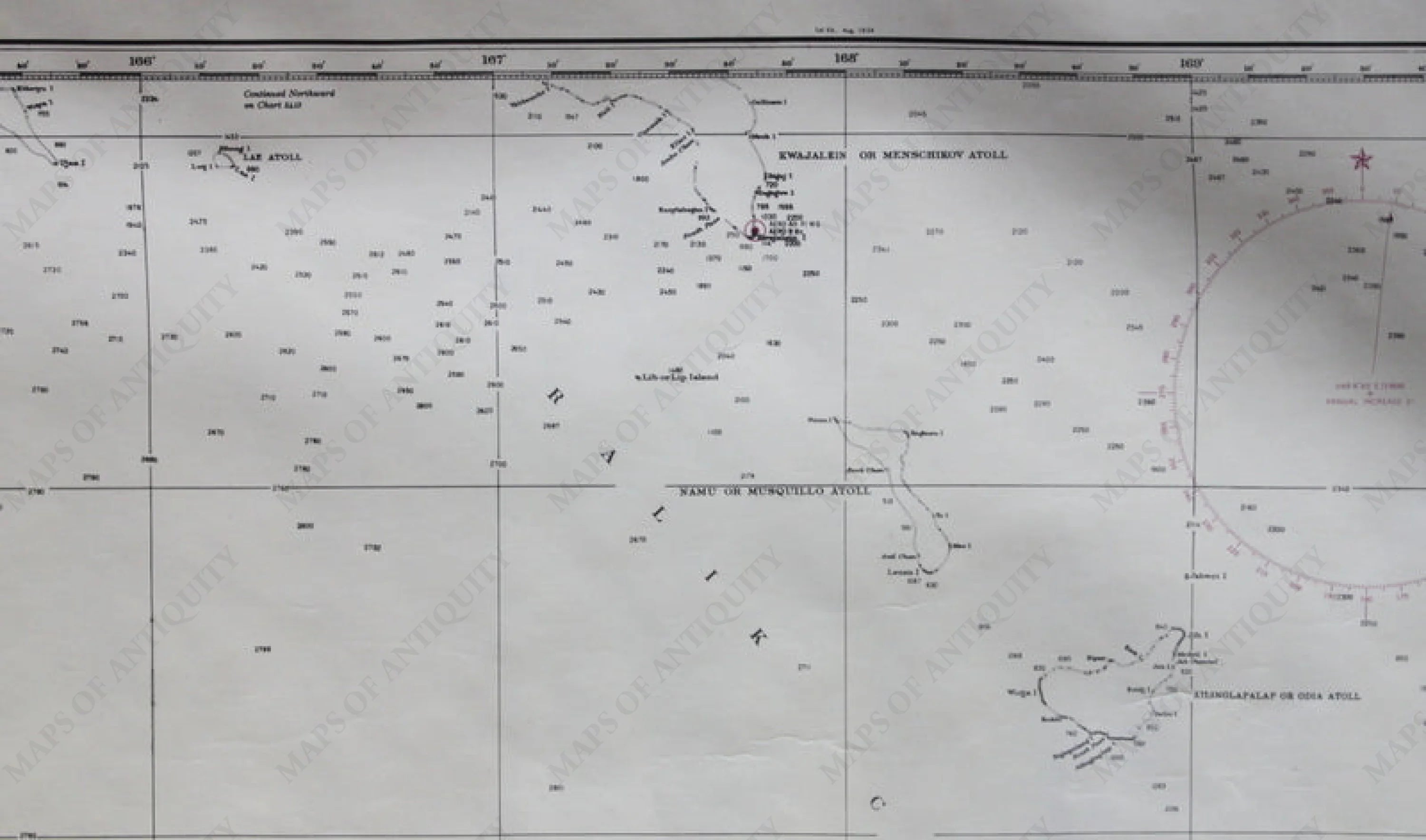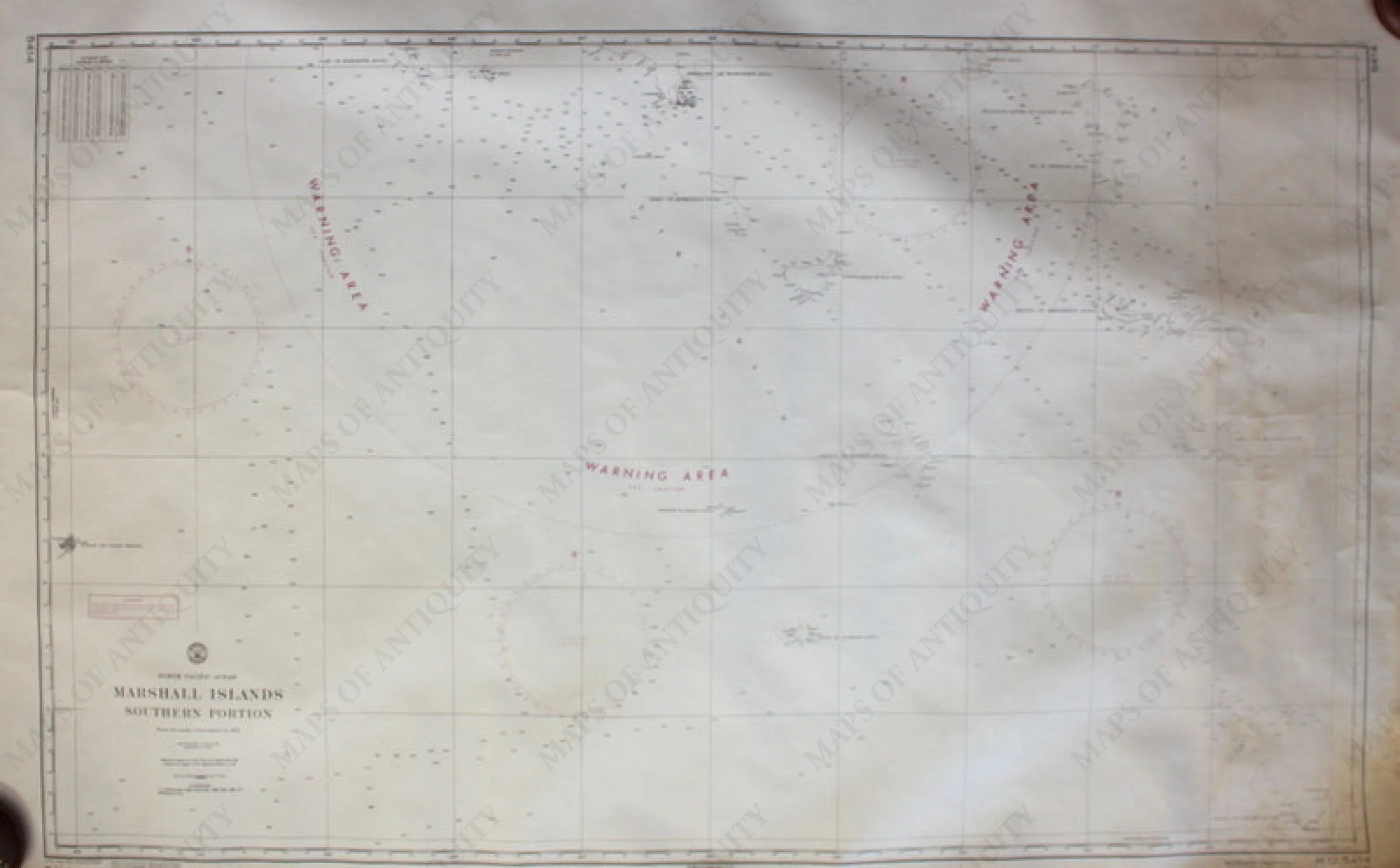 Black and white antique nautical chart, shows the area around the southern Marshall Islands with detailed bathymetric data and warning area marked in red. Good condition, foxing, approximately 29" x 47" to the neat lines