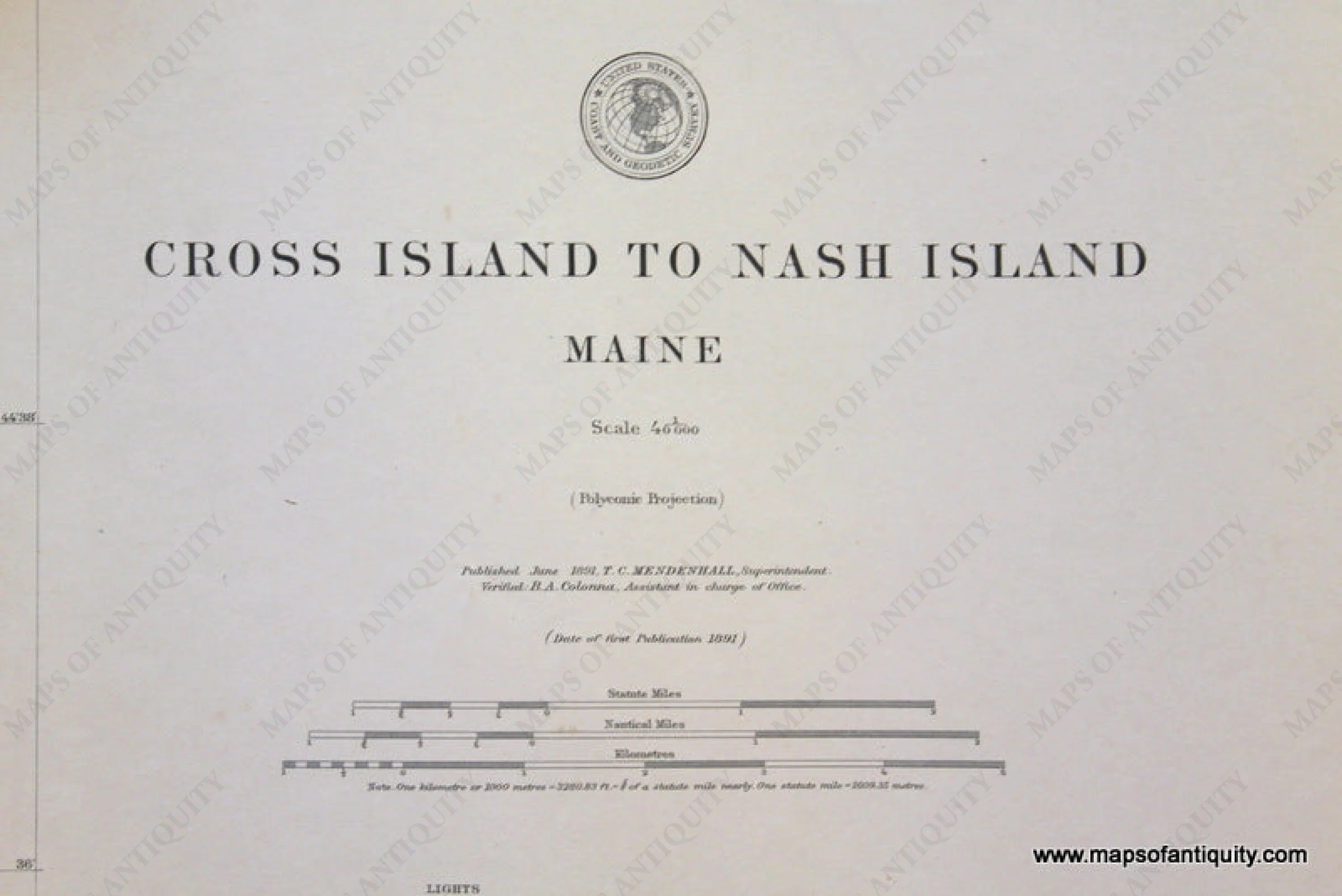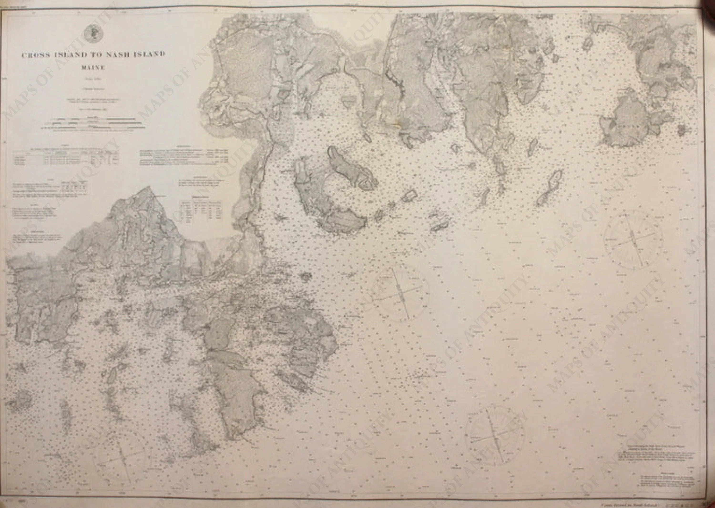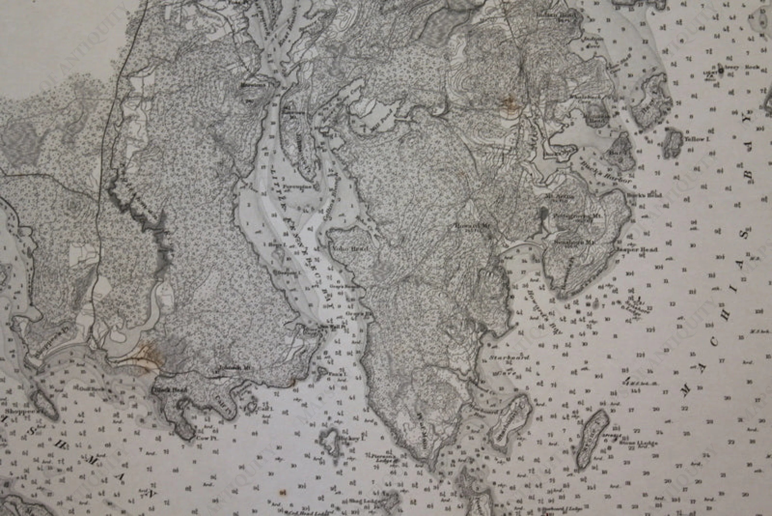 Black and white antique nautical chart, shows the area around Englishman Bay from Cross Island to Nash Island off the coast of Maine with detailed bathymetric data. Very Good antique condition, small tear in bottom edge, approximately 27" x 40" to the neat lines