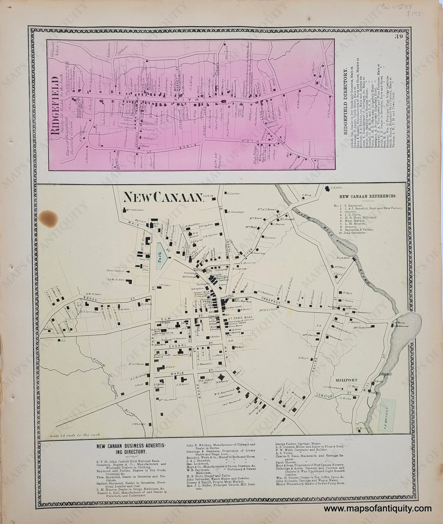 Antique hand-colored map of the villages of New Canaan and Ridgefield, From the Atlas of the Vicinity of New York. Shows property owners at time of publishing. Fair to good antique condition, with one noticeable spot and some toning and other tiny spots/foxing. Small holes at left as issued from binding. Measures approximately 16 x 12.75 inches to the neatline. Price has been reduced according to condition.