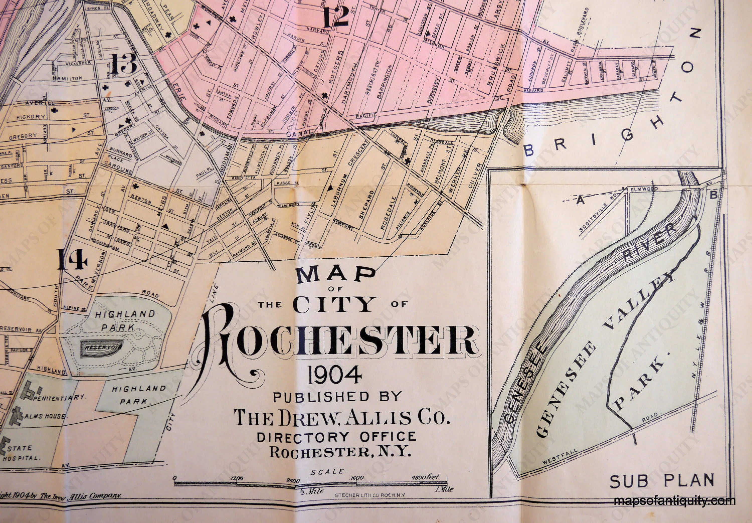 Hand Colored antique folding pocket map of Rochester, New York, at the turn of the century, with fine detail of streets, civic buildings, churches, cemeteries, and schools, with insets of both Seneca Park and Genesee Valley Park, located on opposite shores of the Genesee River and both designed by Frederick Law Olmsted. Published by The Drew Allis Co. Very good condition, with 1.5 inch tear along left margin, measures 24 by 21 inches unfolded, folds up into fabric-covered cardboard cover, 6.5 x 4 inches.