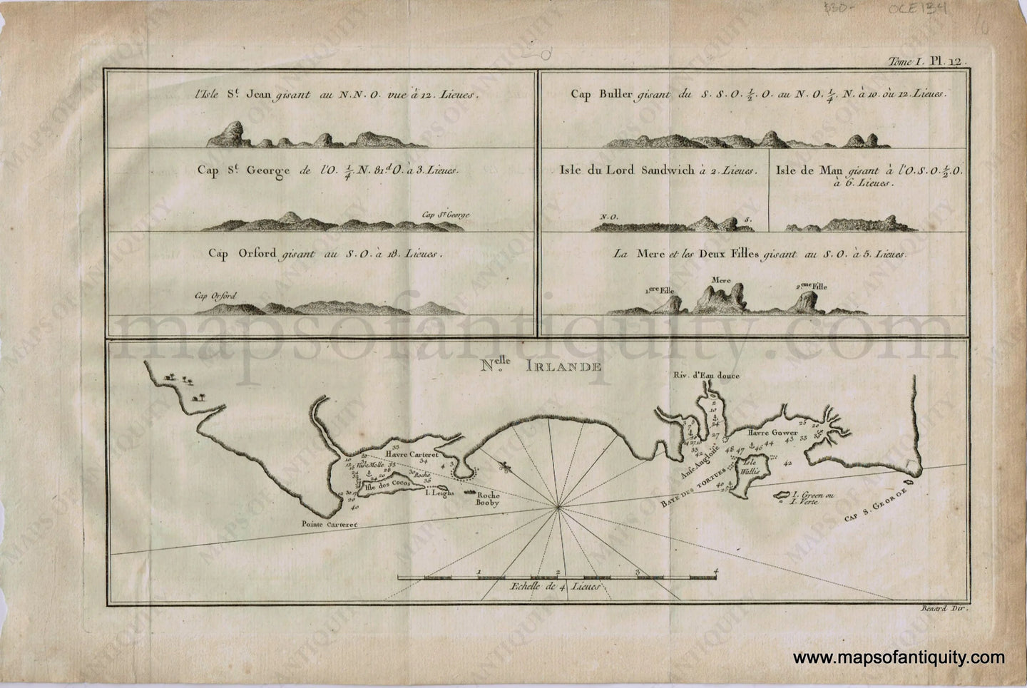 Antique uncolored chart of part of Papua New Guinea, specifically New Ireland, by Bellin, c. 1750. This map shows the south-western coast of New Ireland from Cape Saint George. At top are seven recognition profiles of nearby locations. Good condition with folds as issued and some minor foxing/spotting and toning. Approx. 8 x 12.5 inches to the neatline.