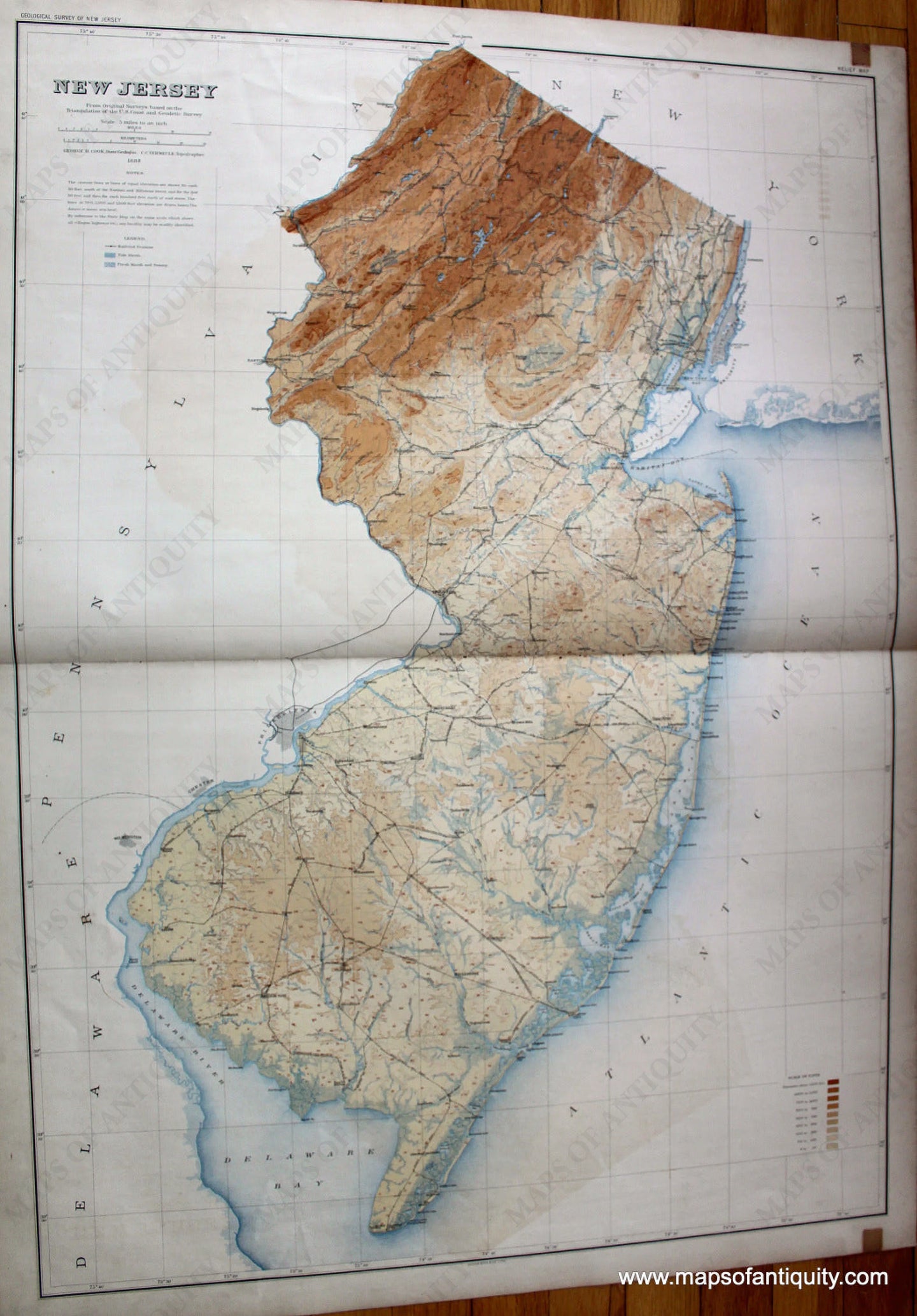 Antique printed color map, Relief Map showing contour lines of equal elevations of New Jersey including Newark, Trenton, the Delaware River and Delaware Bay. From Original Surveys and Levelings based on the Triangulation of the U.S. Coast and Geodetic Survey and scale of tints. Good condition, 24.75 x 34.5" Some surface soiling