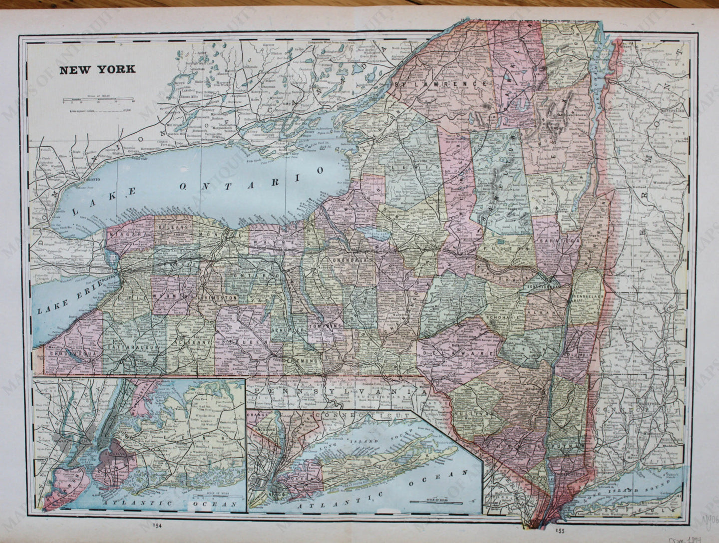 Antique printed color double-sided sheet with a two-page map of New York (Pages 54 and 55). Has inset maps of Kings (Brooklyn), Queens, and Long Island (including Fire Island.) Full, printed color. Good condition with some slight toning and small tears at the edges, as well as one larger tear towards the middle of the map which has been glued. Verso: On page 153, two maps- A map of the Adirondack Mountains in New York and a map of the White Mountains in New Hampshire. These maps are next to each other on one page, with separate neatlines. On page 156, A map of the Lower Half of New York City. Contains the East River Bridge, City Hall Park, Washington Square, part of Central Park, etc. Includes ferry routes. This verso map is on the page with the larger tear. By Cram, in The Standard Atlas and Gazetteer of The World, 1894. Recto Map Measurements: Approximately 13" x 17.75" to the neatline. Map extends slightly past the neatline towards the right at the top and bottom edges. Verso Map Measurements: Adirondack Mts. Map is approx. 9.25" x 6" to the neatline and The White Mts. Map is approx. 8.75" x 6.25" to the neatline. Map of the Lower Half of New York City- Approximately 12" x 8" to the neatline. If you would like to purchase any of these maps separate from the others, please contact us. ****SOLD****