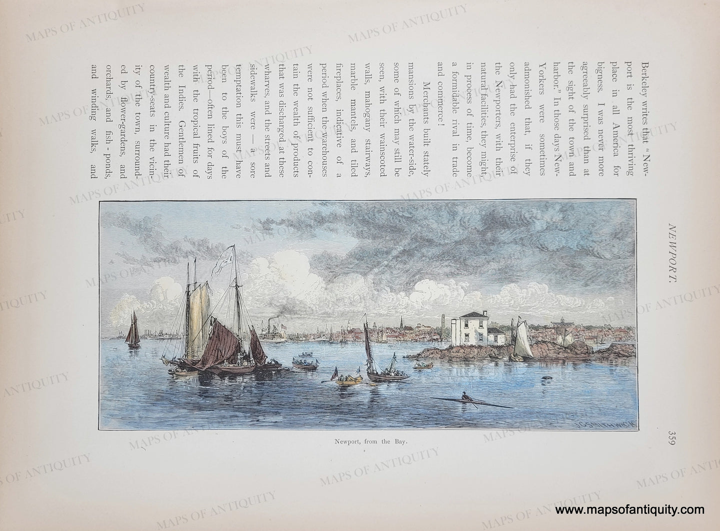 Antique hand-colored view of the Newport, Rhode Island skyline, with boats in the harbor. Antique wood engraving from William Cullen Bryant's Picturesque America, recent hand coloring, Very good overall antique condition, approx. 4 x 9.5 inches. Note: any "rainbows" or strange patterns in the image are called moire pattern- caused by taking a digital photo or scan of the many parallel lines in the print- these are not in the print and we can try to take more photos if you are concerned.