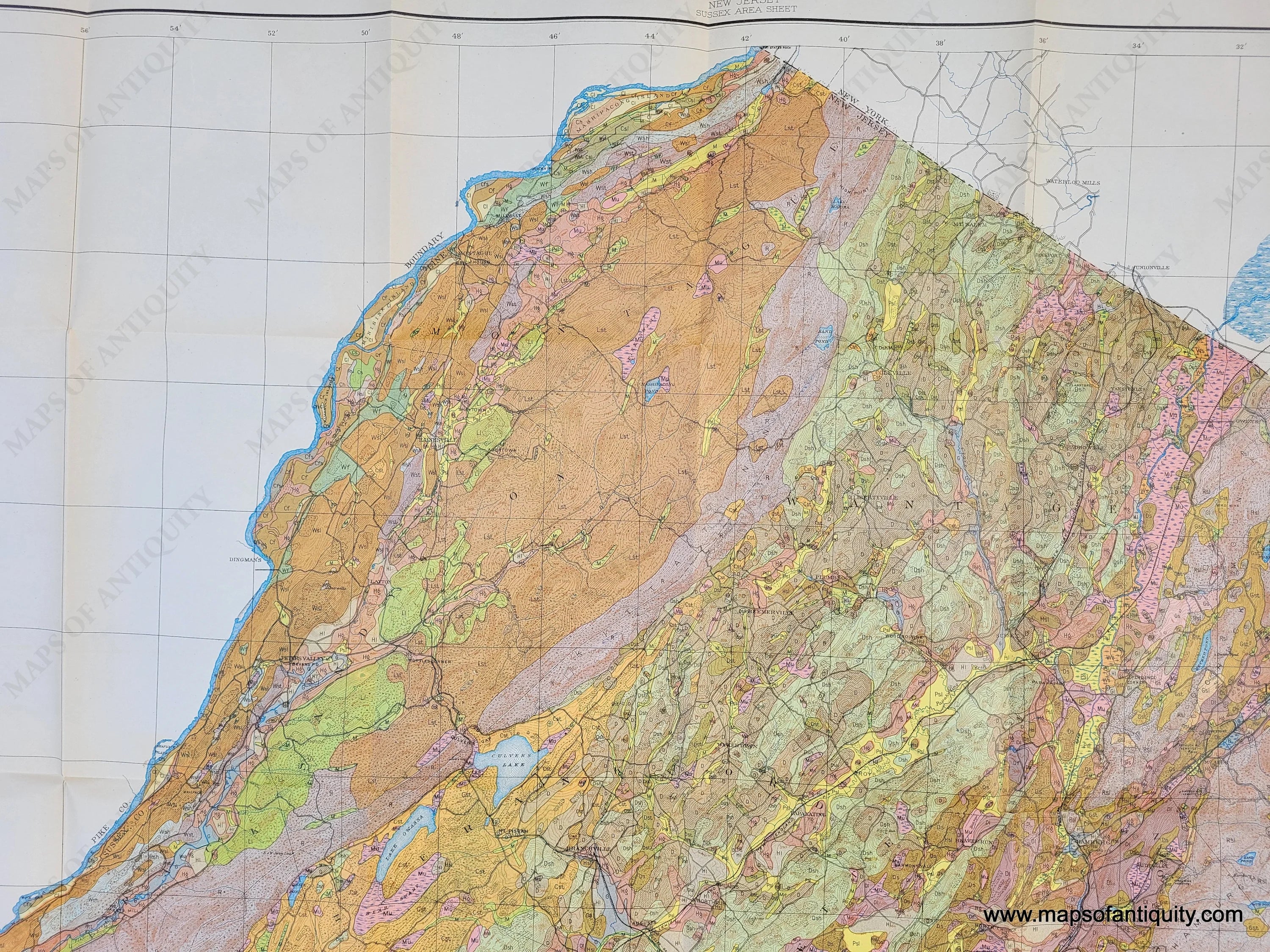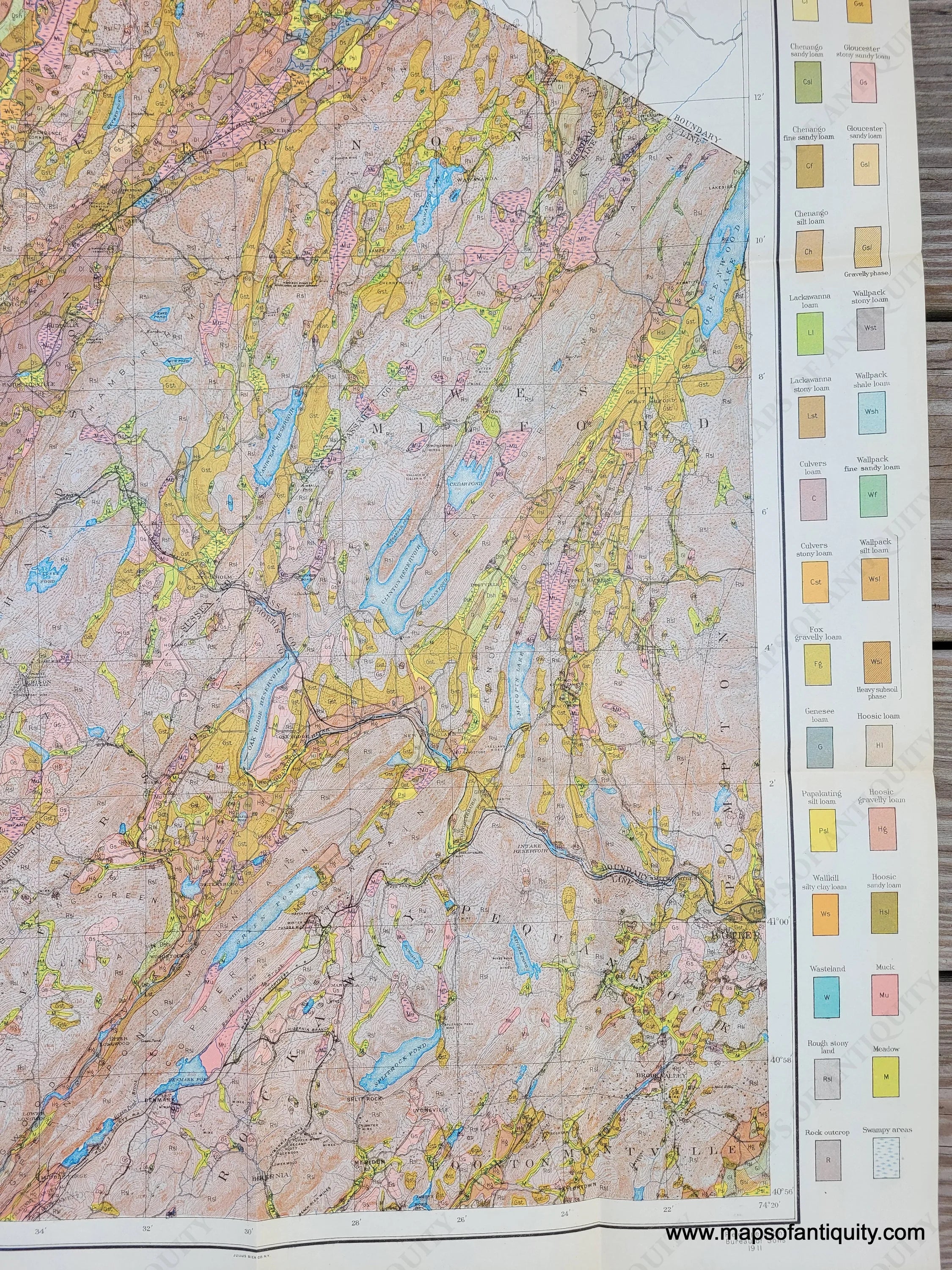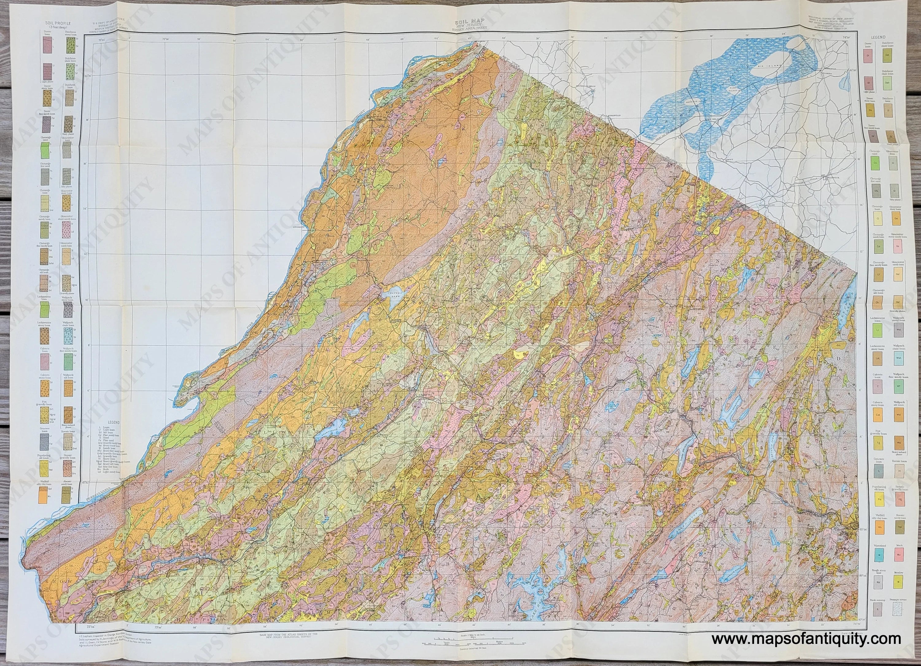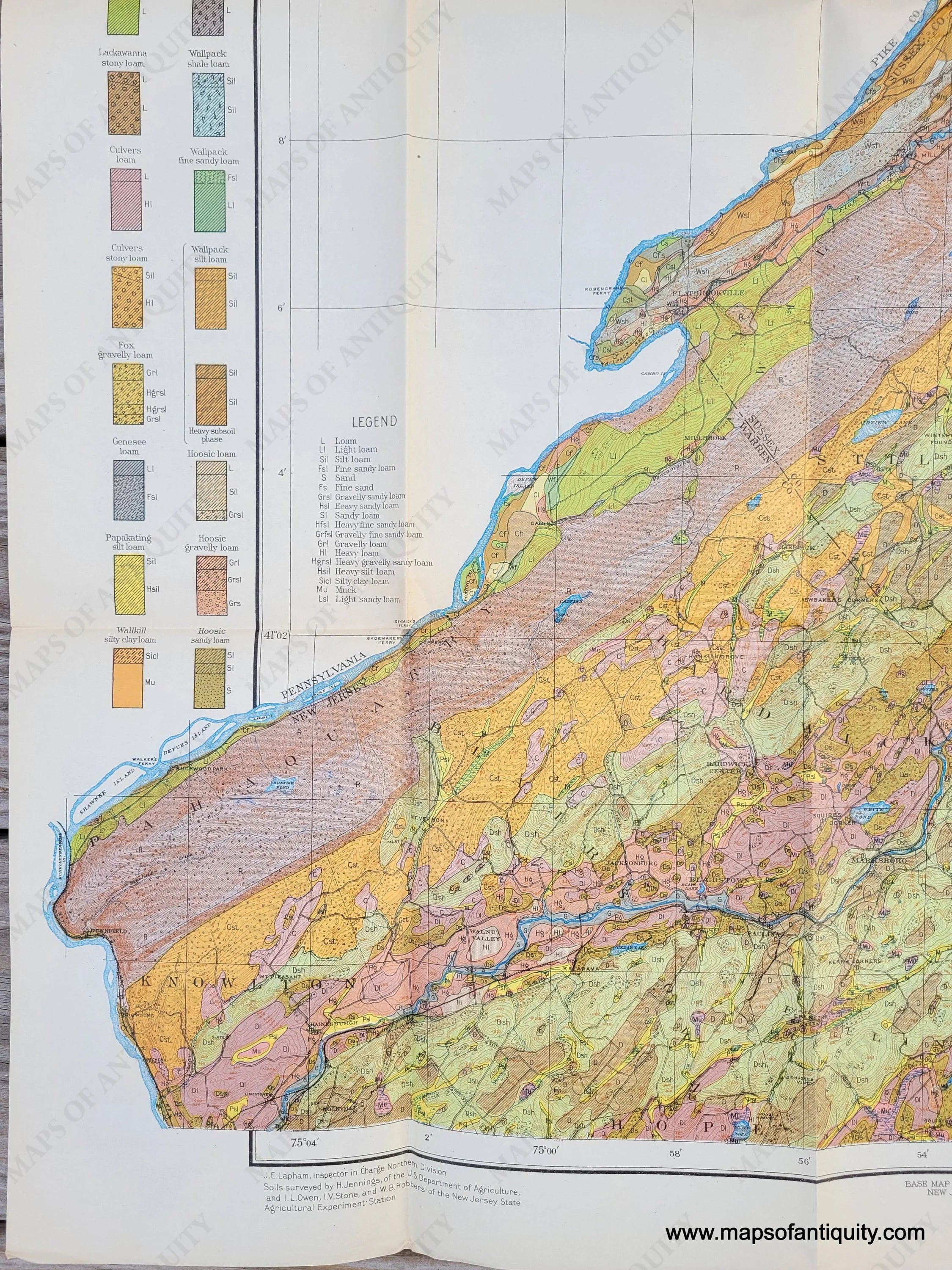 Antique map of the northernmost part of New Jersey published by the U.S. Department of Agriculture, Field Operations of the Bureau of Soils, 1911. This impressive map shows the soil composition with a key on the sides, as well as towns, roads, villages, railroads, lakes, rivers, etc. It covers Montague to Knowlton along the Delaware River (with the Delaware Gap area), and Vernon to Montville in the east. Very good condition with some minor separations at some of the fold intersections. Folds as issued. Measures approx. 30 x 39 inches to the neatline and 33 x 45 inches to the paper edges.