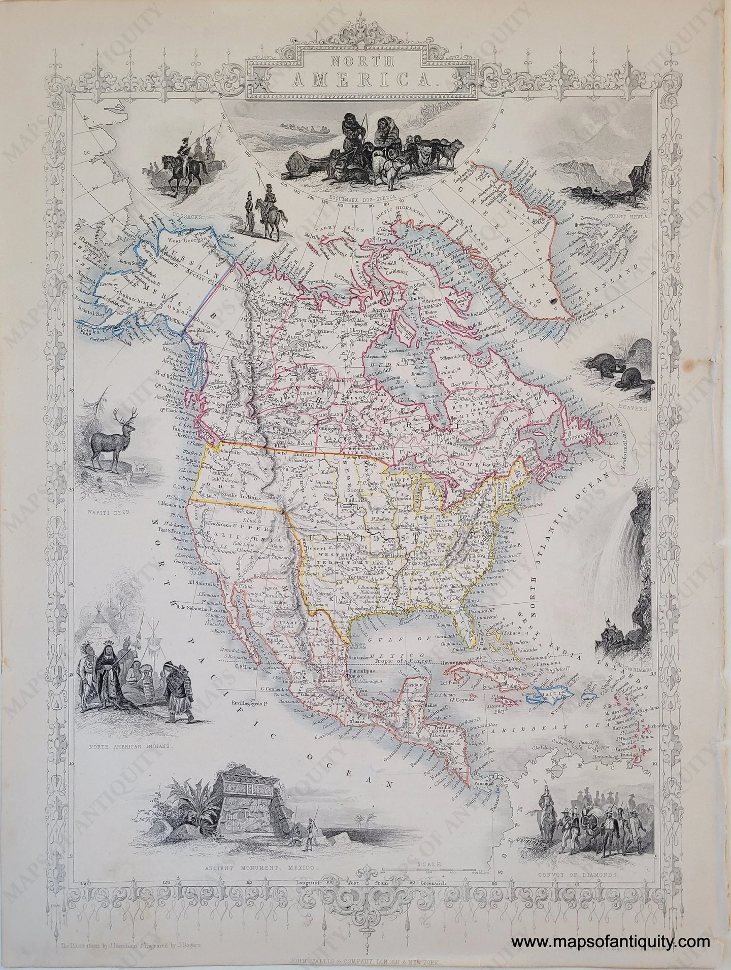 Antique map of North America with outline color. Includes old boundaries for Texas (the so-called "strawberry shape"), New Mexico, the Western Territory (Oklahoma), Upper California, the Missouri Territory, Nebraska Territory, Oregon Territory, Russian America, among others. Surrounded by the vignettes characteristic of Tallis, Ancient Monument, Mexico, North American Indians, Wapiti Deer, Cossacks, Esquimaux Dog-Sledge, Mount Hekla, Beavers, Falls of Niagara, Convoy of Diamonds, with ornate decorative border. Very good condition, with some minor signs of age in the margins including mild stains and a black spot in Greenland. Measures approx. 14 x 9.5 inches.
