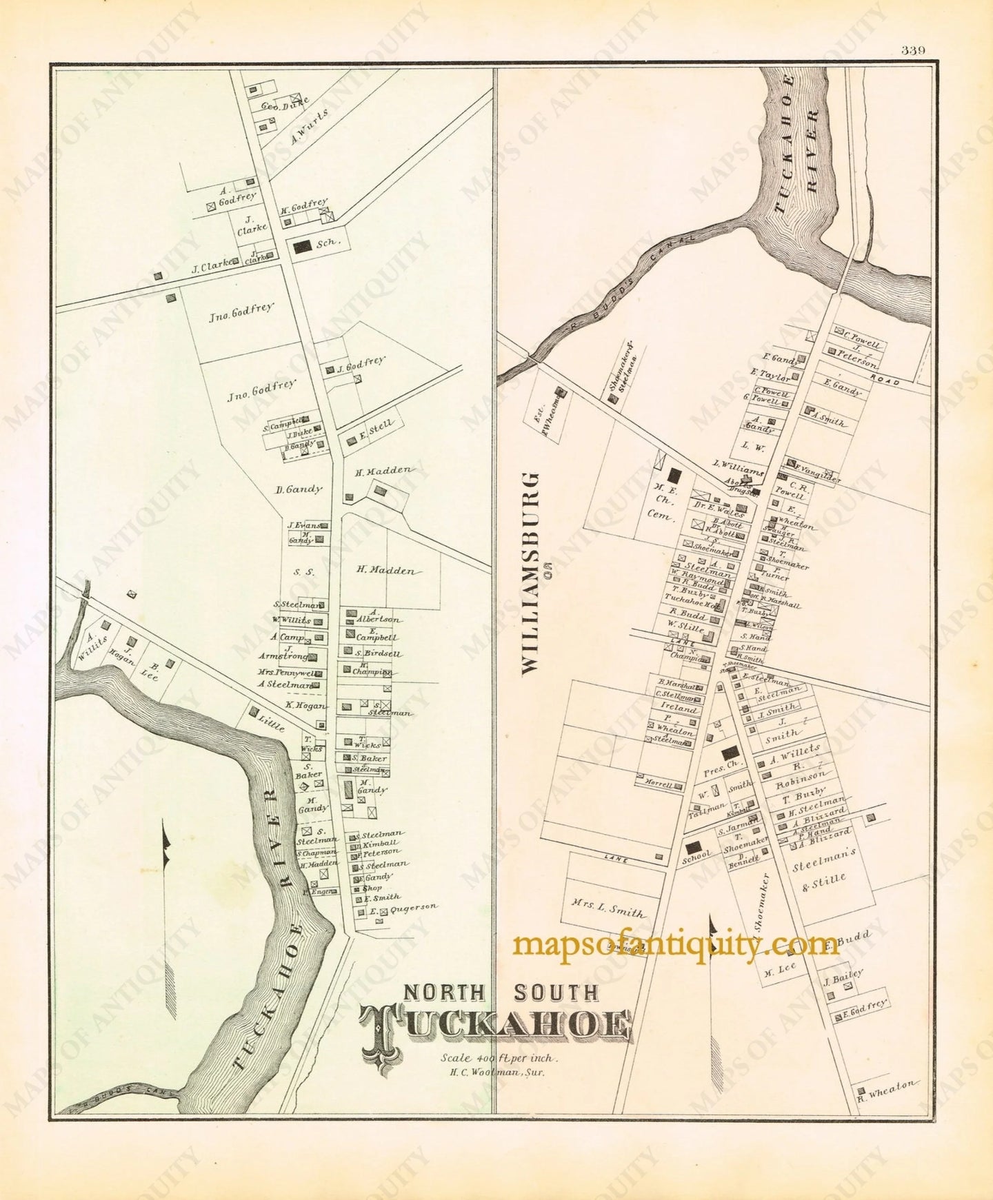 New Jersey Coast Atlas hand colored map showing property owners and buildings of interest. Tuckahoe is in Upper Township in Cape May County of New Jersey. Measures approximately 12" x 10", Very good overall antique condition.