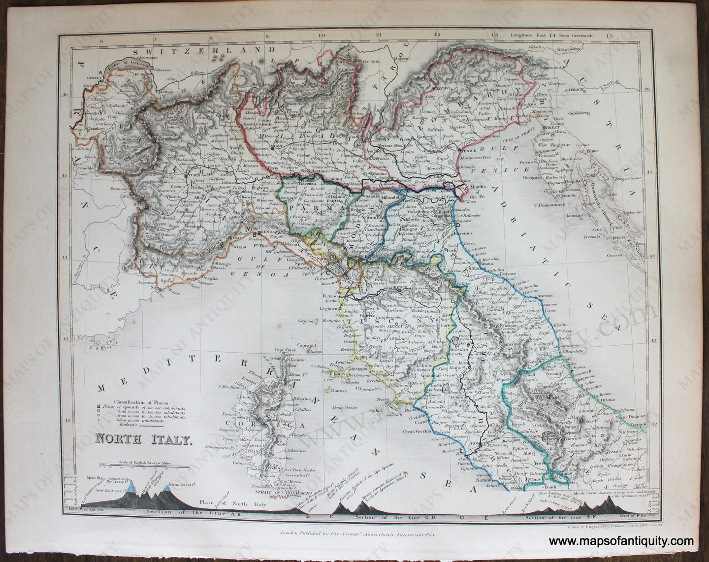 Antique hand colored map of Northern Italy from the Alps to just south of Rome. With three sections showing topography. Engraved by J Dower. From A Descriptive Atlas of Astronomy and of Physical and Political Geography by the Rev. Thomas Milner, maps by Augustus Petermann, and published by William S. Orr & Co, 1850. Very good condition with some minor signs of age, such as spots, toning, and mild image transfer. Tight margin. Page measures approx. 9.25 x 12 inches.