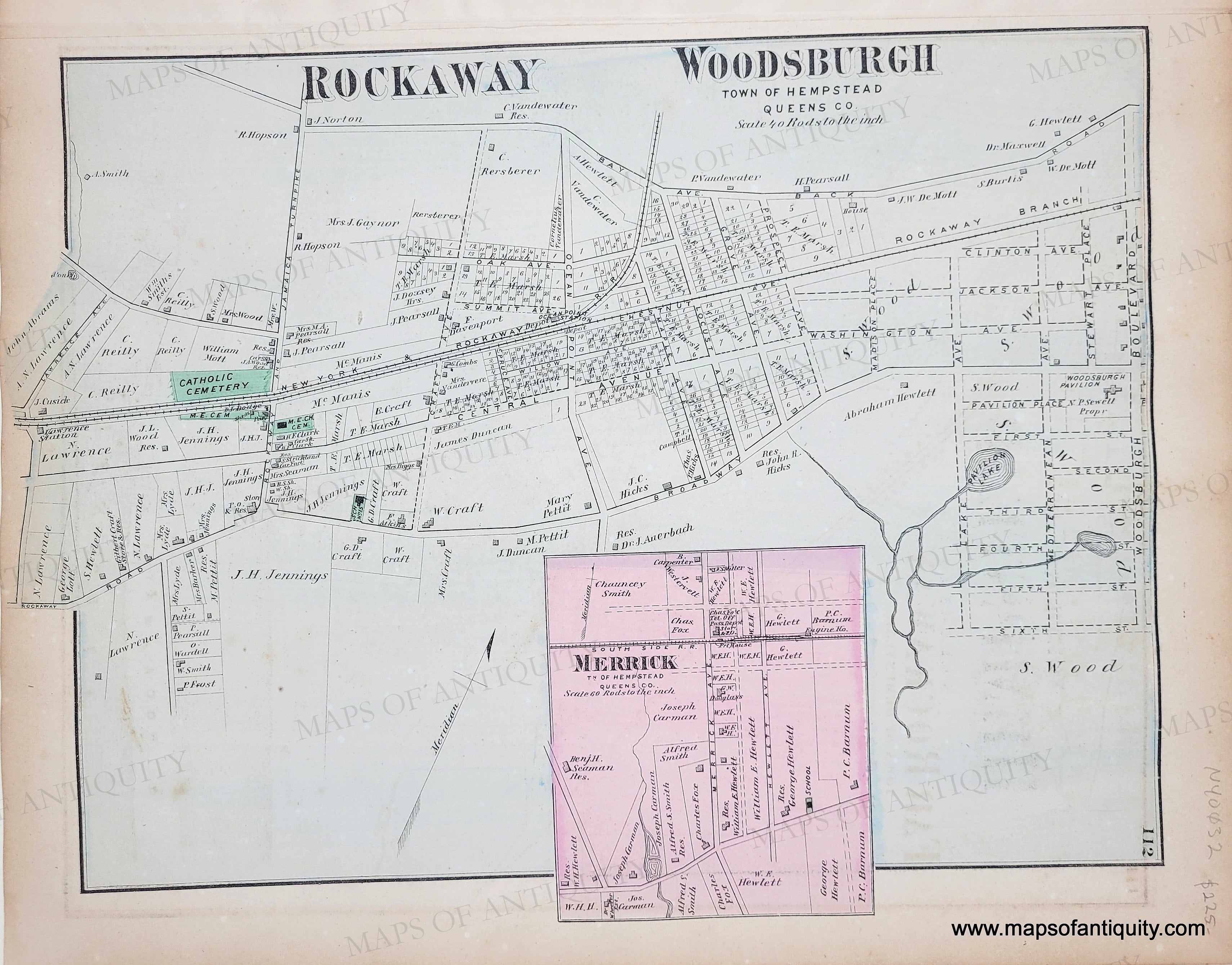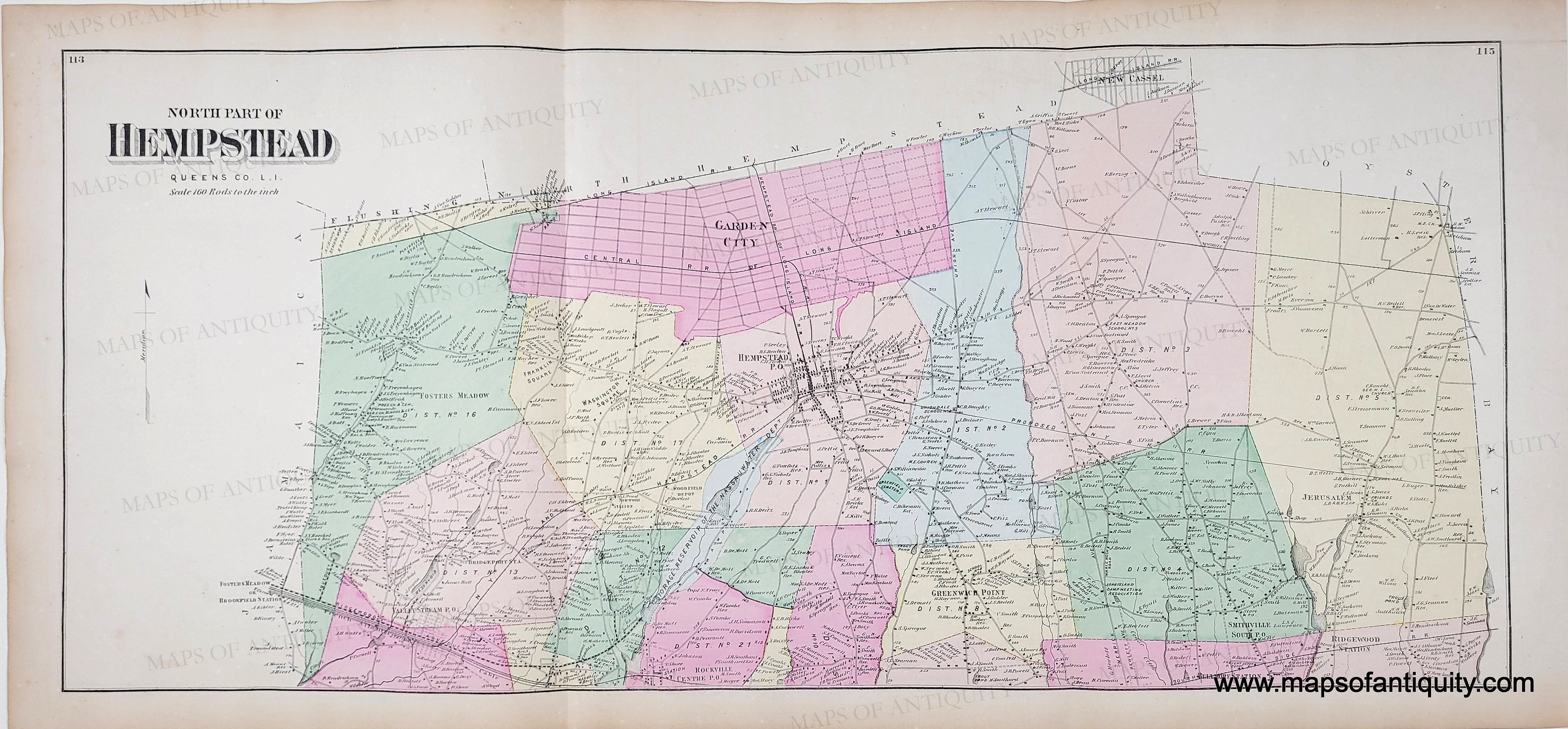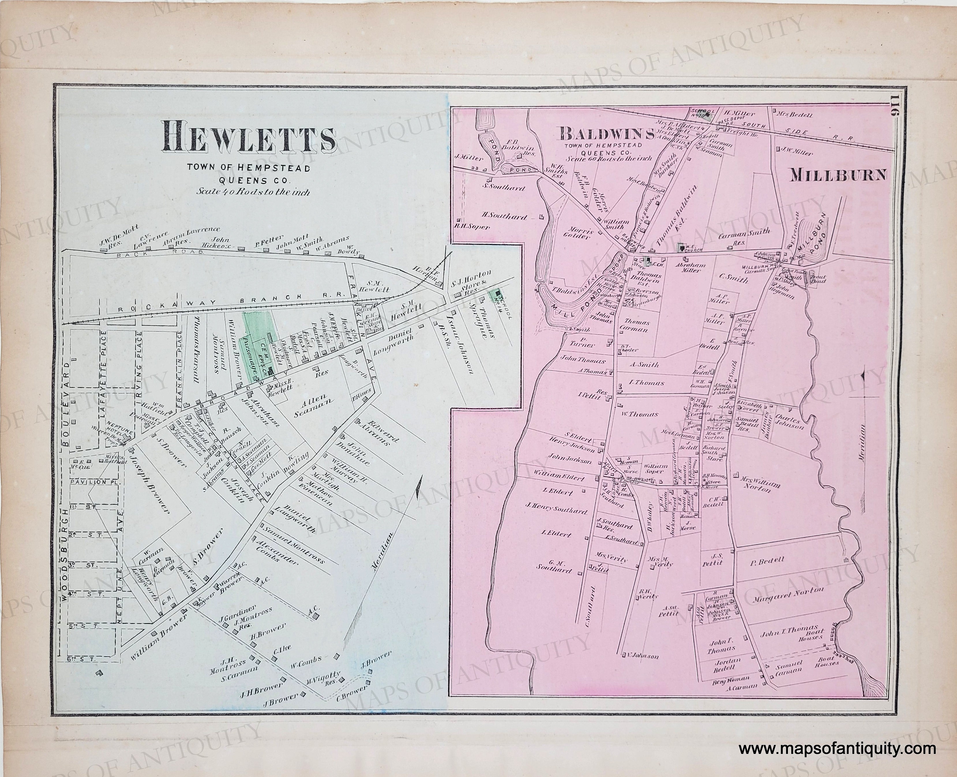 Antique hand-colored map from the Atlas of Long Island, New York, by Beers, Comstock, & Cline, 1873. Centerfold map is the North Part of Hempstead, with Garden City, Smithville, Fosters Meadow, Valley Stream, Greenwich Point, Jerusalem. On back of one side is a map of Rockaway, Woodsburgh, and Merrick and on the back of the other side, Hewletts, Baldwins, Millburn. With folds as issued. Centerfold maps measures approx. 13.5 x 30.5 inches. Verso maps are approx. 10 x 13.5 inches. Good to very good overall antique condition with mild toning, areas of mild stains, some mild foxing.