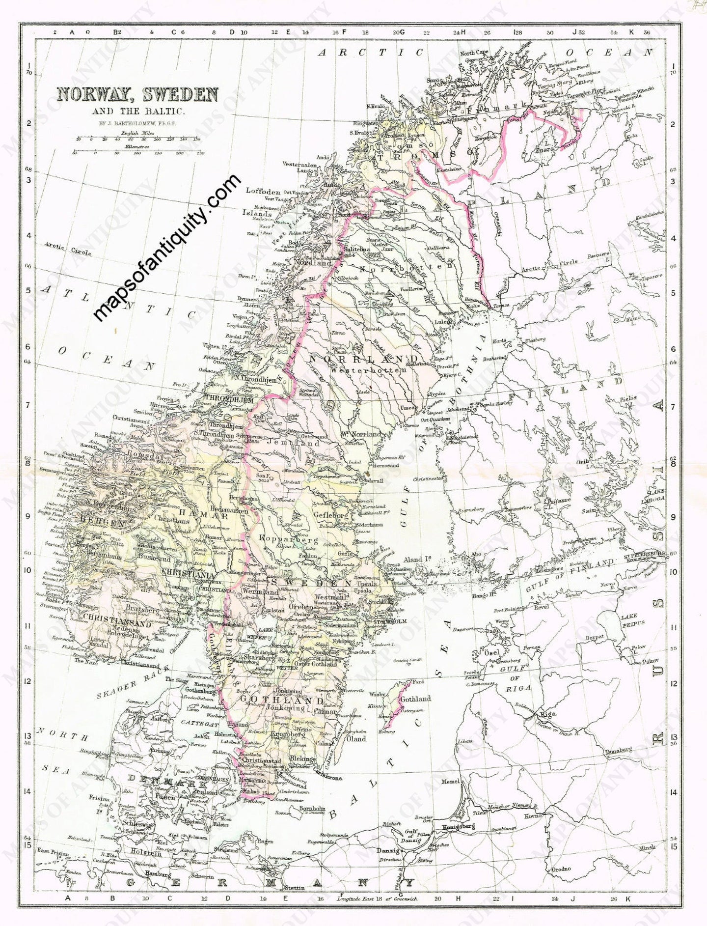 Antique printed color map of Norway, Sweden, the Baltic Sea and surrounding coastlines of Russia, Germany and Denmark, with fine detail of regions, cities, rivers and marine water bodies, very good condition, approx. 12.25 x 9.25 inches.