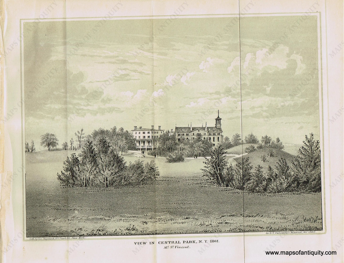 Antique black & white lithograph folding print published in D. T. Valentine's 1862 manual of New York City, shows a view of the monastary and chapel at Mount Saint Vincent in Central Park, Manhattan. After the convent of nuns relocated from the buildings, they were used for a number of function including the park's headquarters, an aid station for wounded soldiers, an art museum, and a tavern. Good condition, two folds in center, approximately 7" x 9" to the paper edges