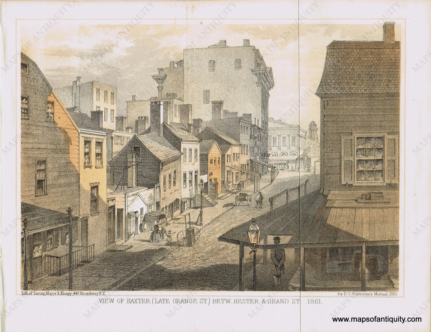 Antique color lithograph folding print published in D. T. Valentine's 1863 manual of New York City, shows a view of shops and houses along the sides of Baxter Street, figures and carts in foreground. Baxter Street was most famous for being the primary Street which made up the Five Points intersection. Good condition, approximately 7" x 11" to the paper edges