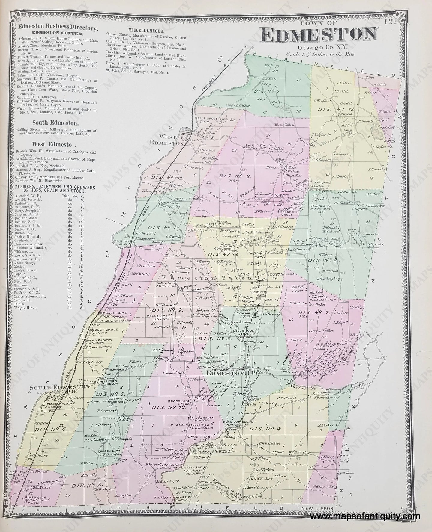 Antique map of Edmeston, New York, published in the Atlas of Otsego Co. New York by F.W. Beers, A.D. Ellis, & G.G. Soule, 1868. With original hand-color, this map is colored by district, and includes roads, rivers, notable hills, property owners names, proposed railroad, and business directory. Very good antique condition with some small spots. The coloring is a bit messy. Measures approx. 15 x 12 inches to the decorative border.