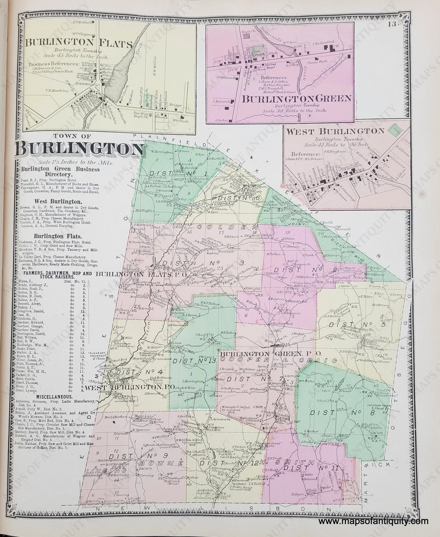 Antique map of Burlington, New York, published in the Atlas of Otsego Co. New York by F.W. Beers, A.D. Ellis, & G.G. Soule, 1868. With original hand-color, this map is colored by district, and includes roads, rivers, notable hills, property owners names, and Business Directory. Inset maps of Burlington Flats, Burlington Green, and West Burlington. This map has names in block letters seem to be related to deeds, such as Cooper & Craig, who received a deed to a tract of land in George Croghan’s Otsego Patent in 1786. Very good antique condition with some small spots. The coloring is a bit messy. Measures approx. 15 x 12 inches to the decorative border.