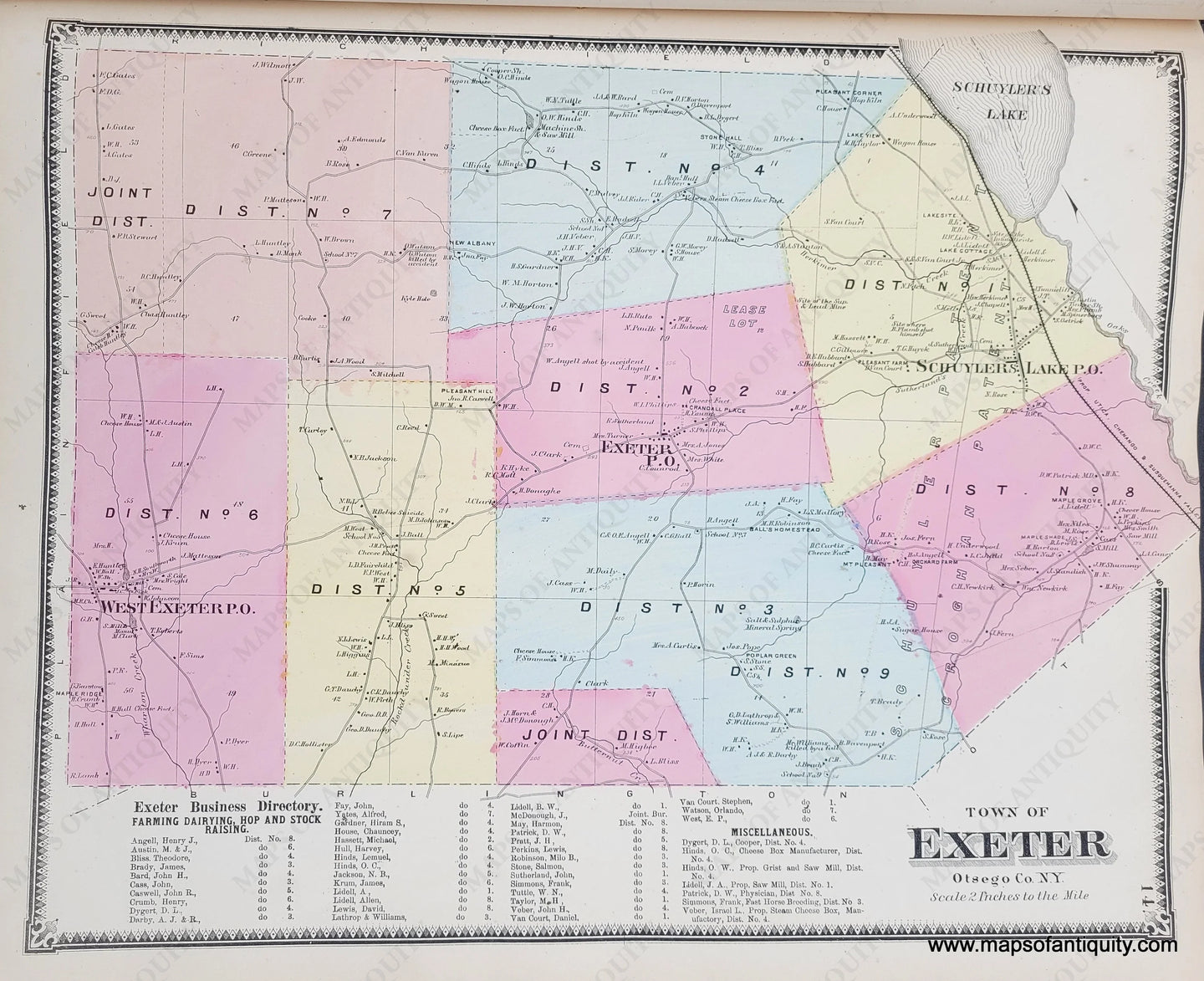 Antique map of Exeter, New York, published in the Atlas of Otsego Co. New York by F.W. Beers, A.D. Ellis, & G.G. Soule, 1868. With original hand-color, this map is colored by district, and includes roads, rivers, notable hills, property owners names, proposed railroad, and Business Directory. Block letters on left show land patents belonging to Schuyler and Croghan. Very good antique condition with some small spots and slight damage to the surface on right side in a vertical line. The coloring is a bit messy. Measures approx. 15 x 12 inches to the decorative border.