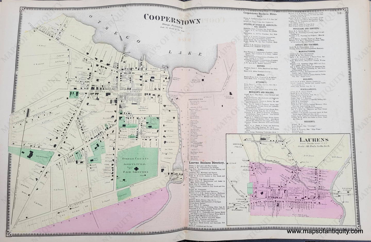 Antique map of Cooperstown, New York, published in the Atlas of Otsego Co. New York by F.W. Beers, A.D. Ellis, & G.G. Soule, 1868. With original hand-color, this map is colored by district, and includes roads, a railroad, rivers, Otsego Lake, the Agricultural Fair Grounds, property owners names, and a business directory. Inset map of Laurens in the Township of Otsego. Very good antique condition with some small spots. The coloring is a bit messy. Measures approx. 15 x 22.5 inches to the decorative border.