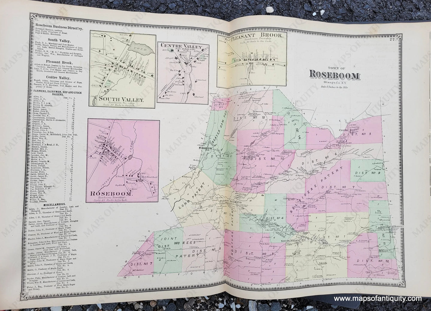 Antique map of Roseboom, New York, published in the Atlas of Otsego Co. New York by F.W. Beers, A.D. Ellis, & G.G. Soule, 1868. With original hand-color, this map is colored by district, and includes roads, rivers, property owners names, and land patents. Inset maps of South Valley, Roseboom, Centre Valley, and Pleasant Brook, and a Business Directory. Very good antique condition with some small spots. The coloring is a bit messy. Measures approx. 15 x 22.5 inches to the decorative border.
