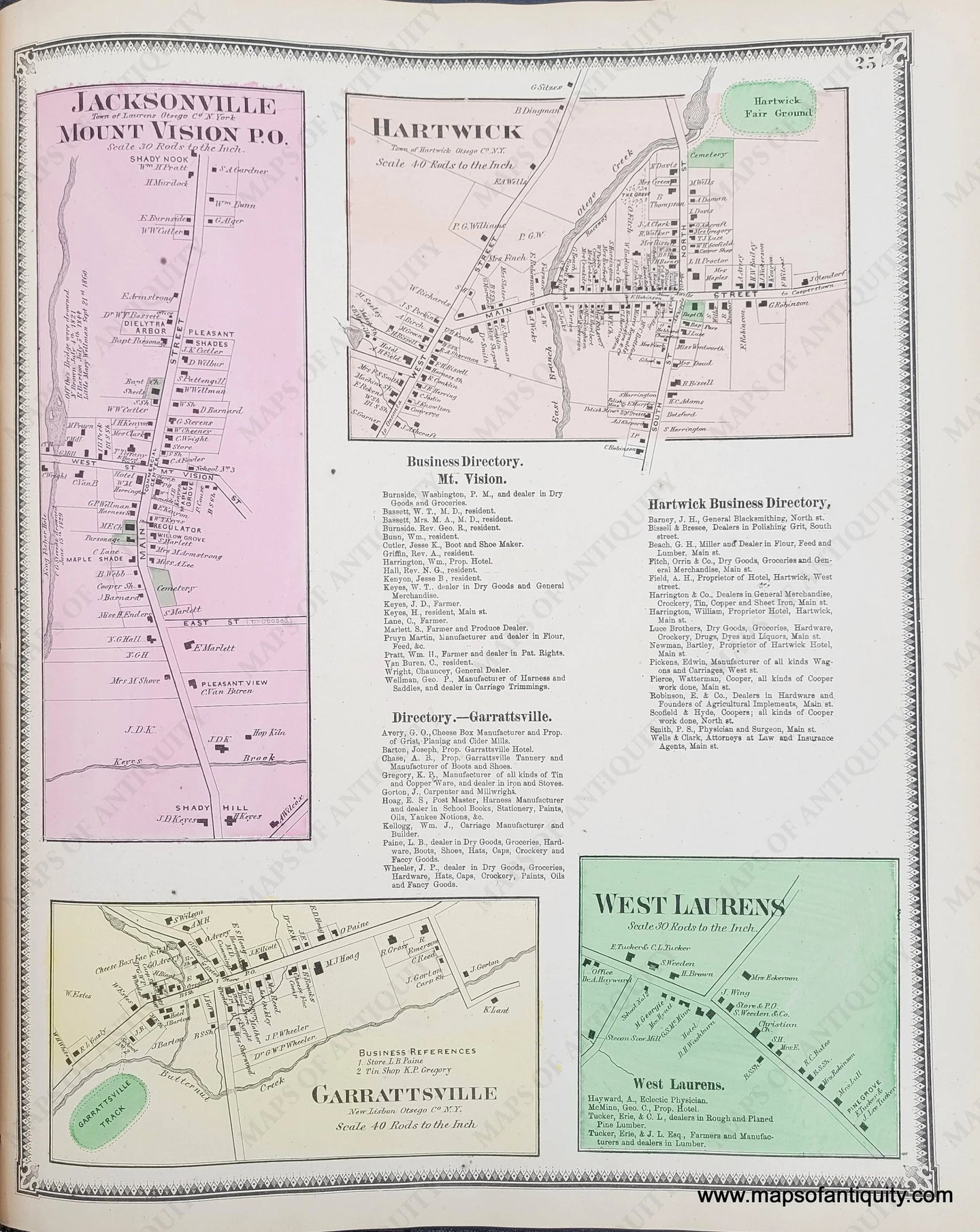 Antique page of maps of villages in Laurens, Hartwick, and New Lisbon NY, published in the Atlas of Otsego Co. New York by F.W. Beers, A.D. Ellis, & G.G. Soule, 1868. With original hand-color, includes roads, rivers, property owners names, and Business Directory. Very good antique condition with some small spots. The coloring is a bit messy. Measures approx. 15 x 12 inches to the decorative border.