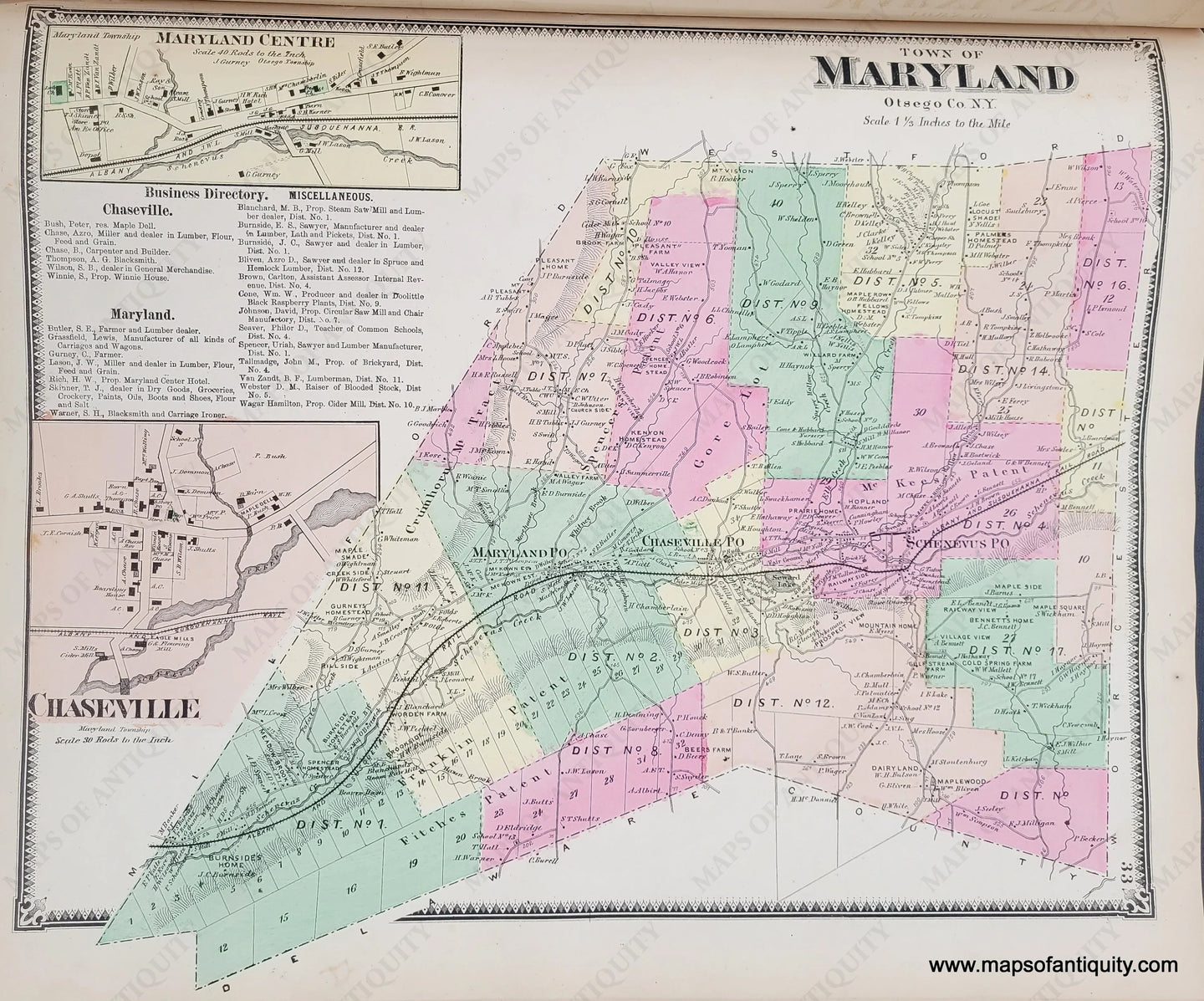Antique map of Maryland, New York, published in the Atlas of Otsego Co. New York by F.W. Beers, A.D. Ellis, & G.G. Soule, 1868. With original hand-color, this map is colored by district, and includes roads, a railroad, rivers, notable hills, property owners names, and land patents belonging to McKees, Franklin and Fitch, to name a few. Inset maps of Maryland Centre and Chaseville. Very good antique condition with some small spots. The coloring is a bit messy. Measures approx. 15 x 12 inches to the decorative border.