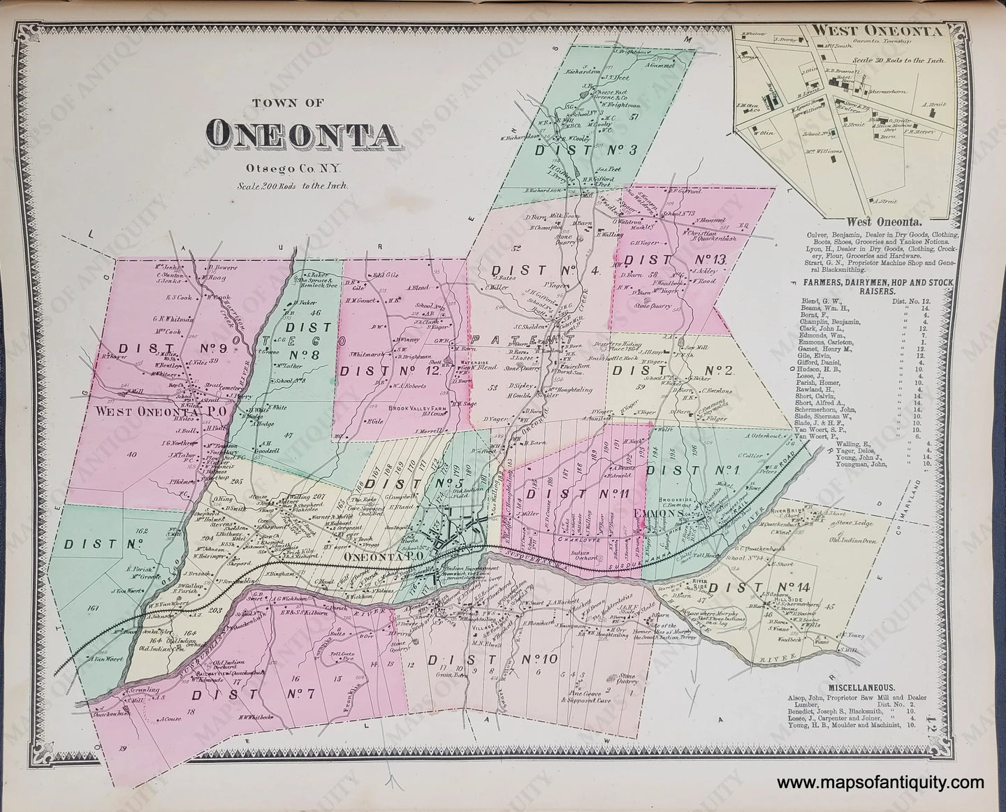 Antique map of Oneonta, New York, published in the Atlas of Otsego Co. New York by F.W. Beers, A.D. Ellis, & G.G. Soule, 1868. With original hand-color, this map is colored by district, and includes roads, a railroad, rivers, property owners names, and a land patent belonging to Otego. Inset map of West Oneonta. Very good antique condition with some small spots. Some pencil writing from a previous owner. The coloring is a bit messy. Measures approx. 15 x 12 inches to the decorative border.