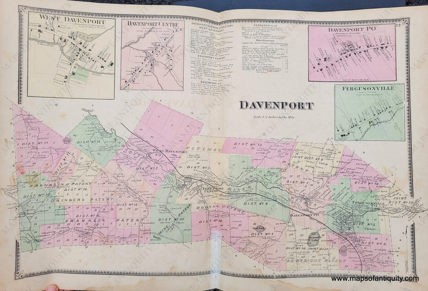 Antique map of Davenport, New York, published in the Atlas of Delaware County, New York by F.W. Beers, A.D. Ellis, & G.G. Soule, 1869. With original hand-color, includes property owners names, roads, rivers, a business directory, etc. Densley populated areas are sometimes enlarged on another sheet. Inset maps of West Davenport, Davenport Centre, Davenport PO, and Fergusonville. Fair to good antique condition with some spots and stains. A three inch tear at bottom. Measures approx. 14 x 21.5 inches to the decorative border. Priced as-is.
