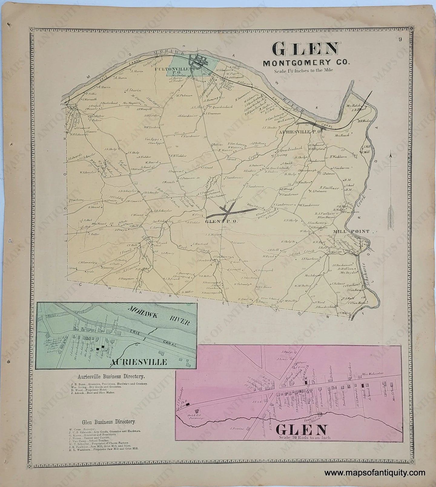 Antique hand-colored map of the town of Glen from "Atlas of Montgomery and Fulton Counties New York," includes Fultonville, and Mill Point with insets of Glen and Auriesville. Shows the names of property owners at that time. Good condition, toned, stain in right-hand corner, approximately 17" x 15" to the paper edges