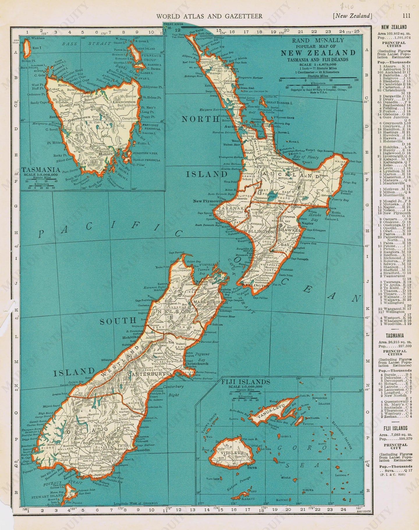 Antique printed color map of New Zealand, Tasmania, and Fiji Islands with regional delineations, published in 1940 by Rand-Mcnally as part of the Colliers World Atlas and Gazeteer. Includes approximately 14" x 11" to the paper edges.