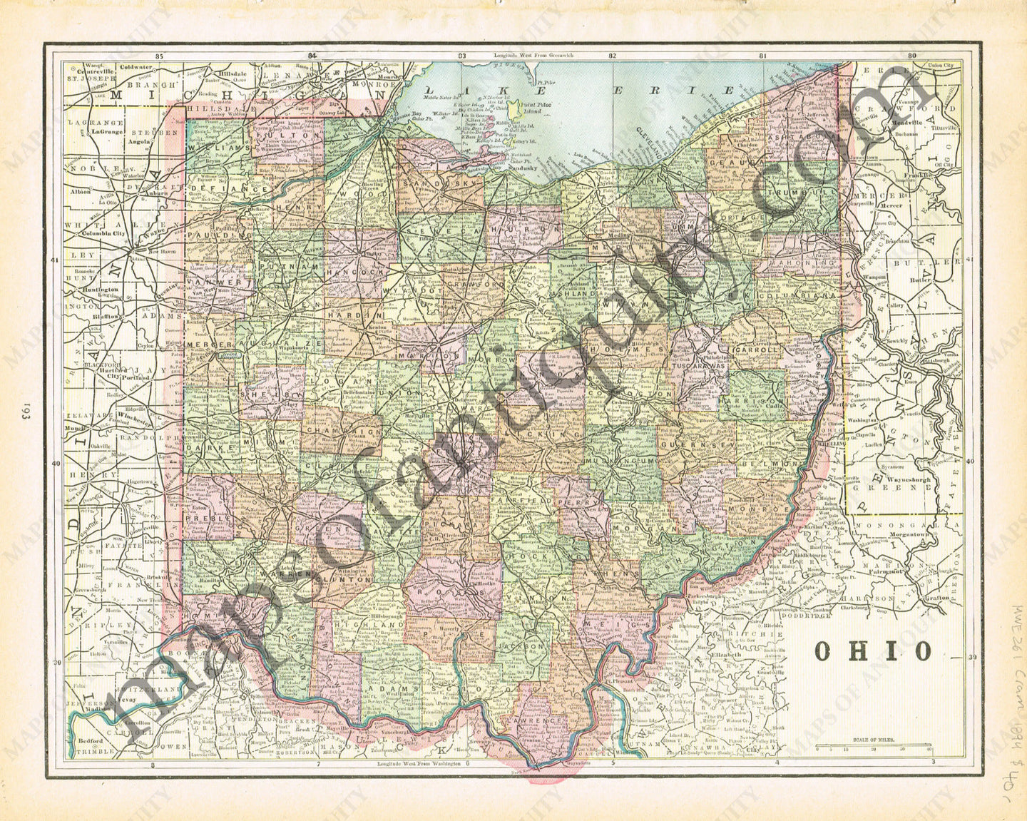 Antique printed color map of Ohio. verso: City map of Cincinnati including several parks. Very good condition with some slight toning at the edges. By Cram, in The Standard Atlas and Gazetteer of The World, 1894. Approx. 10.25" x 13" to the neatline.