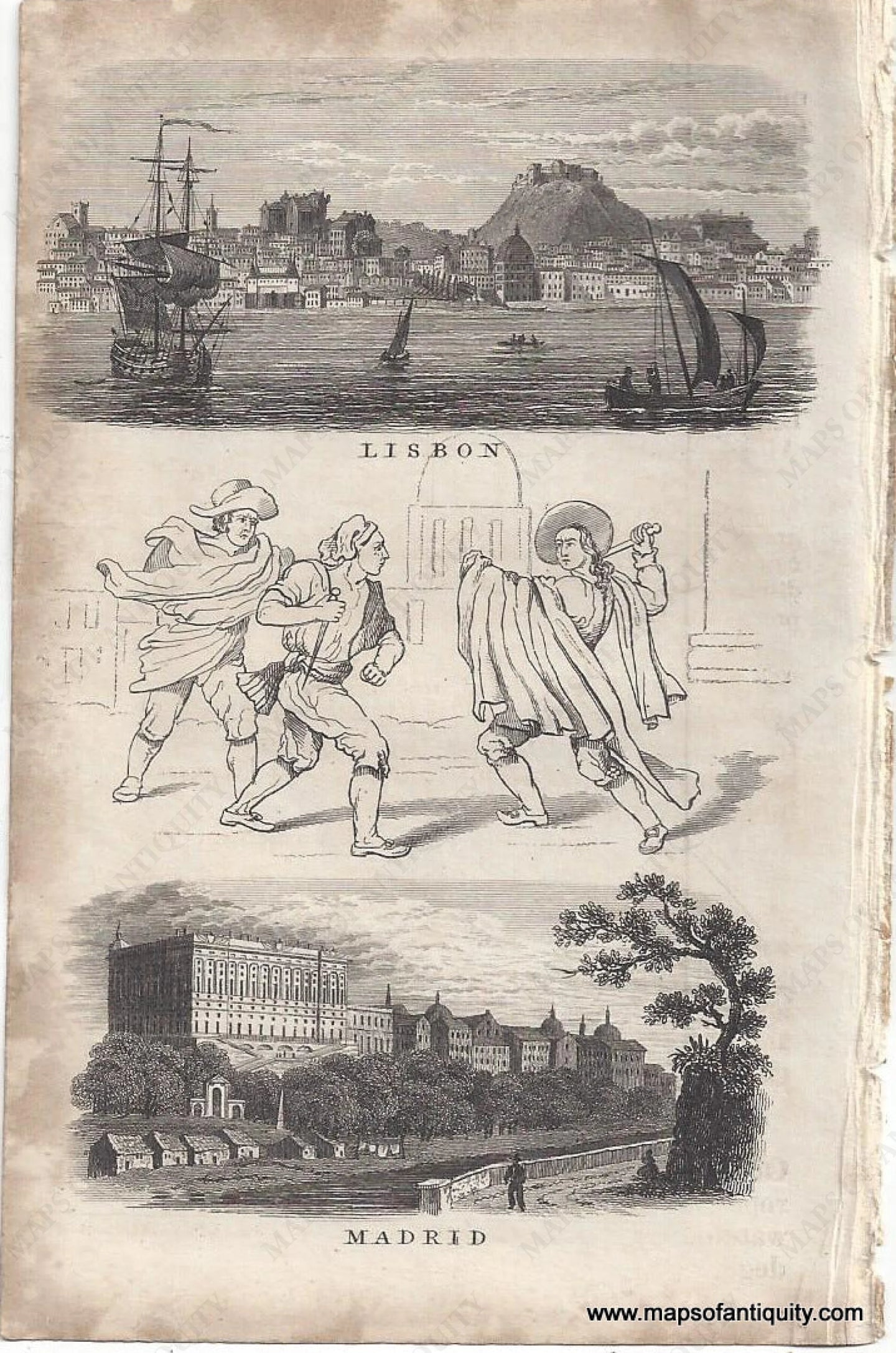 Antique print from A Grammar of General Geography for the use of Schools and Young Persons… by Rev. J. Goldsmith, engraved by Sidney Hall and published by Longman, Rees, Orme, Brown, and Green, c. 1829. This page has two city views with an illustration of people in between. If you are interested in only part of the page, you can fold the rest under or hide it with a mat when framing. Very good antique condition with stains at the edges (these can be hidden with a mat when framing). Measures approx. 5.5 x 3.5 inches to the paper edges.