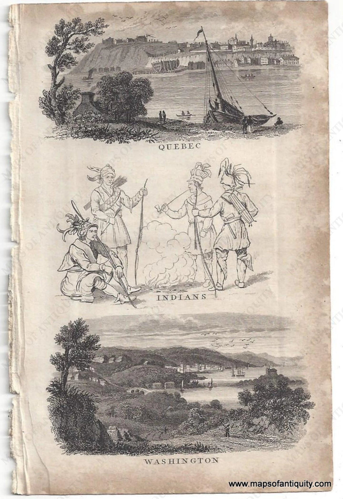 Antique print from A Grammar of General Geography for the use of Schools and Young Persons… by Rev. J. Goldsmith, engraved by Sidney Hall and published by Longman, Rees, Orme, Brown, and Green, c. 1829. This page has two city views with an illustration of people in between. If you are interested in only part of the page, you can fold the rest under or hide it with a mat when framing. Very good antique condition with stains at the edges (these can be hidden with a mat when framing). Measures approx. 5.5 x 3.5 inches to the paper edges.