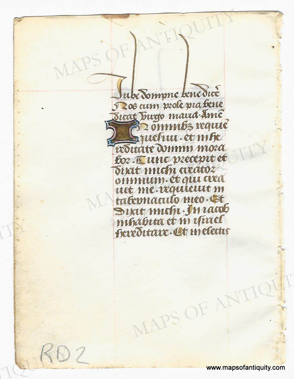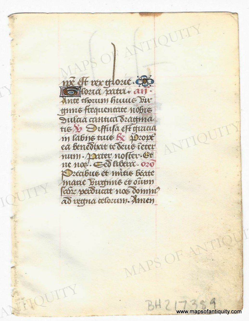 Genuine antique leaf from a tiny Book of Hours, with gold illumination of one letter on each side. The text translates in part as: Grace has been poured freely into your lips. Because of this, God has blessed you in eternity. This small Book of Hours was believed to have been made in France circa 1490. A Book of Hours was a popular medieval Christian devotional book for laypeople, containing prayers, psalms, and readings for specific times (hours) of the day, structured around devotion to the Virgin Mary and other saints, often personalized and lavishly decorated with illuminated manuscripts. They became medieval bestsellers, reflecting a growing lay desire for personal religious practice, and are now prized examples of Gothic art. Very good antique conditioning with slight soiling at the edges. Measures approx. 4 x 3 inches to the paper edges.