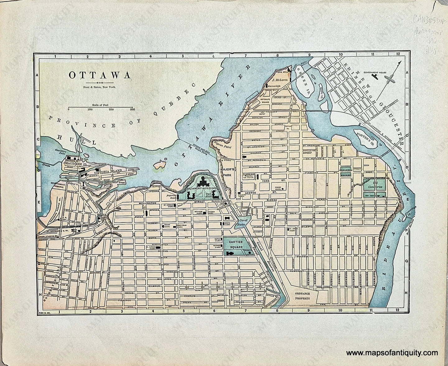 Antique printed color map of the city of Ottawa, Canada, published by Hunt & Eaton, c. 1892. Shows a general overview of the city blocks, including names of major streets, canals, railroads, topographical details, points of interest, etc. Good overall antique condition with mild toning throughout, and off-set printed color. Measures approximately 8.25" x 11.75" (H x W) to the neatline. *Note: Priced As Is.