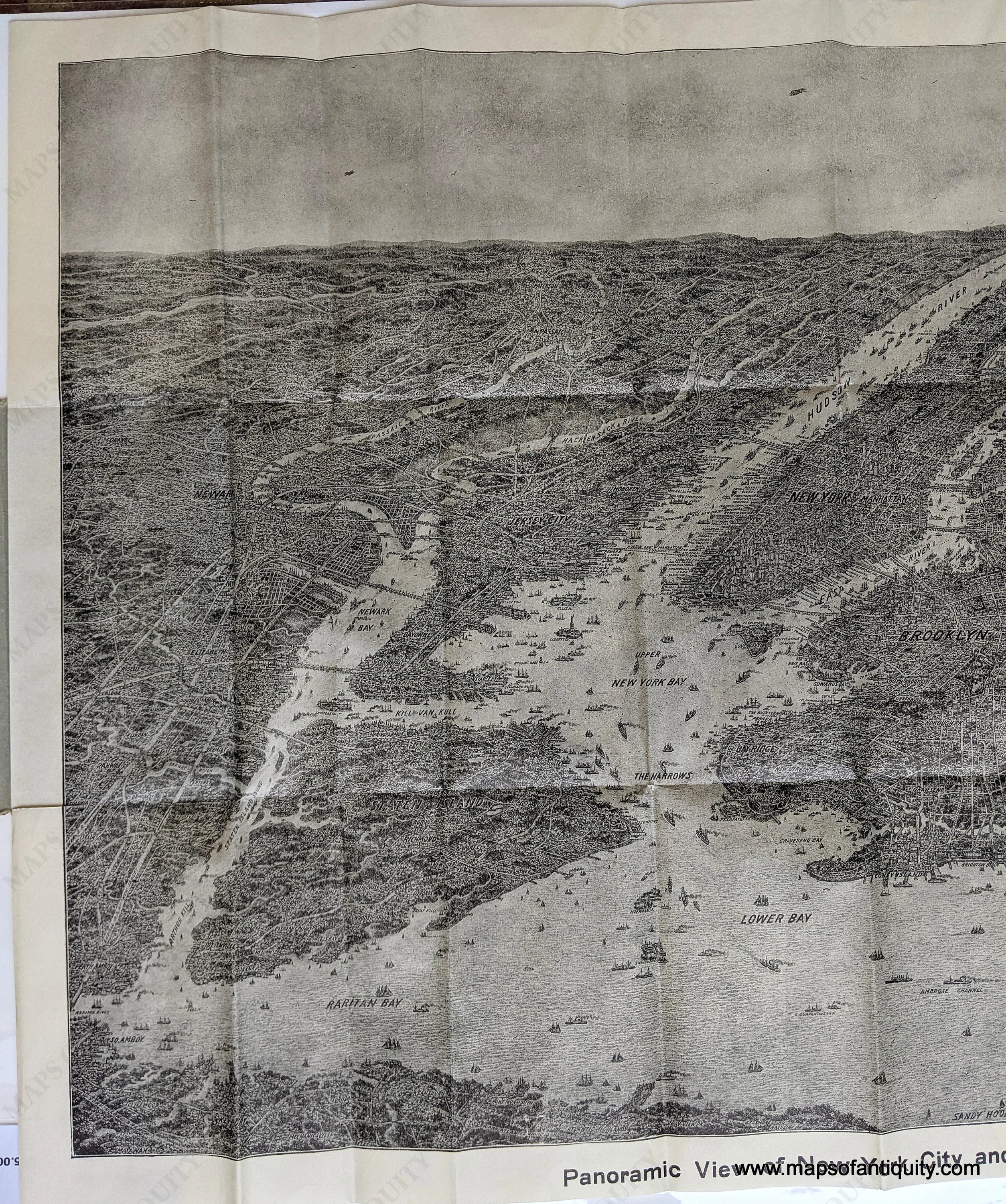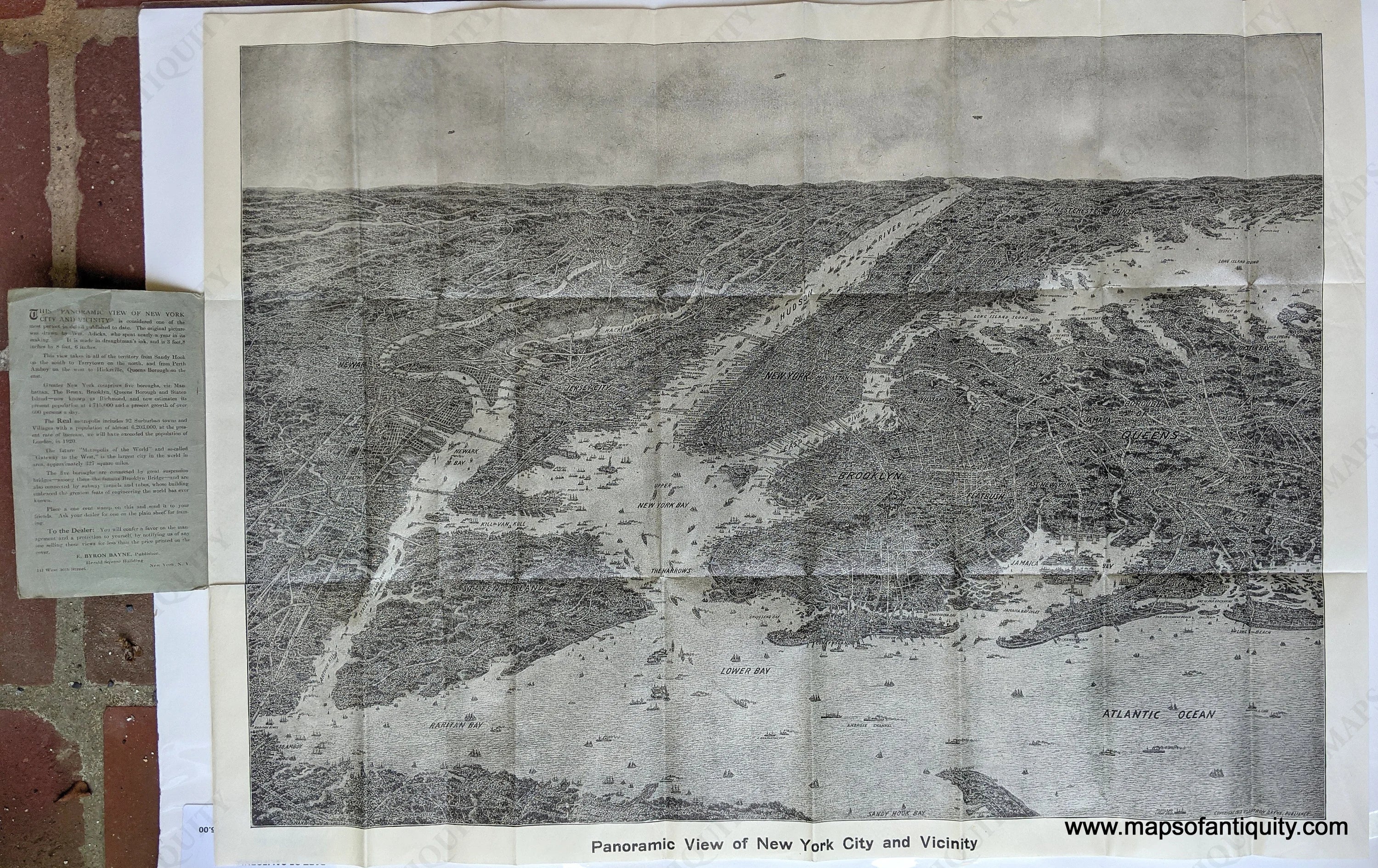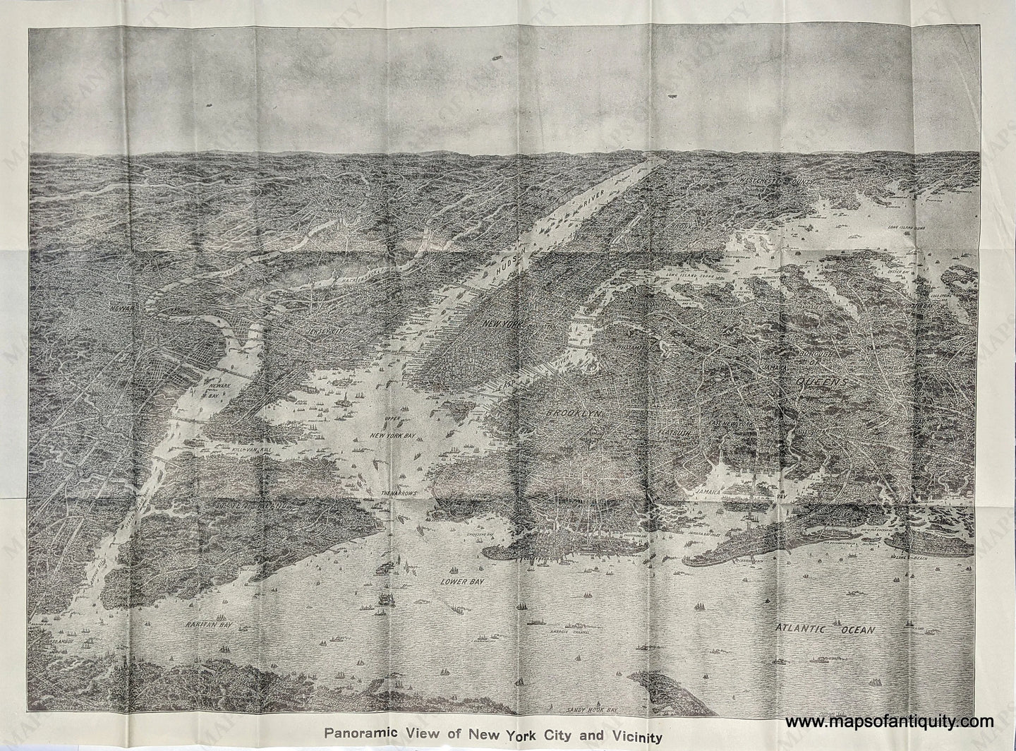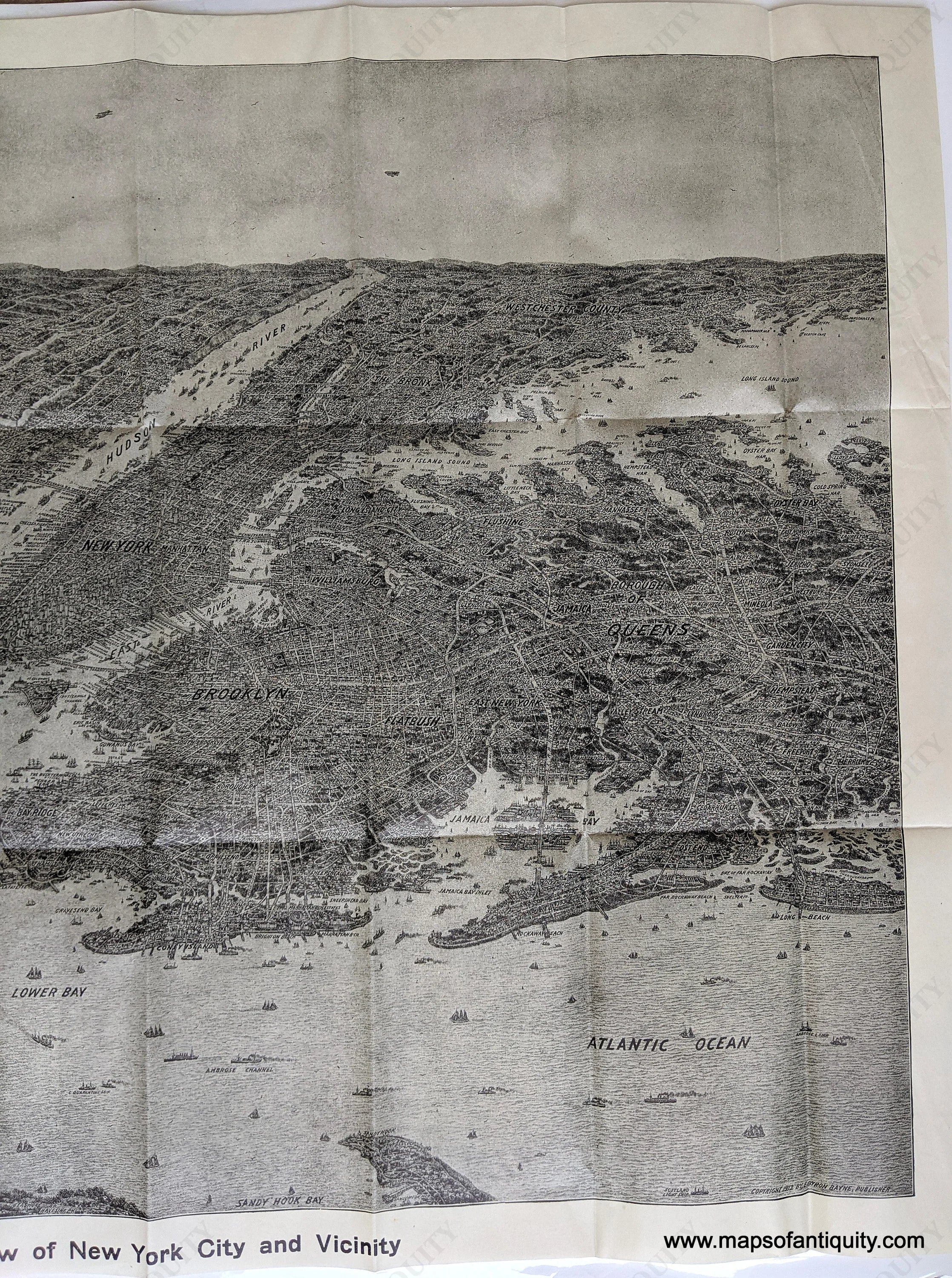 Black and white antique bird's eye view of New York City and vicinity, by Byron Bayne, 1912. Includes Manhattan, Brooklyn, the Bronx, Queens, Staten Island, Newark, Jersey City, and more. Rivers, bodies of water, and places are labeled. Very good overall antique condition. With folds as issued and some wear at the folds and some separation at fold intersections. Paper jacket is attached and can be folded back for framing. Approx. 22.5 x 30 inches.