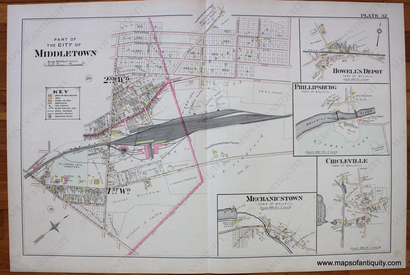 Antique printed color map from the Atlas of Orange County, New York, by Lathrop, published by A. H. Mueller & Co in 1903. Inset maps of Mechanicstown, Circleville, Phillipsburg, and Howell's Depot. Showing the names of property owners of the time.Has a center fold as issued. Very good condition with some foxing/spots, a few small black ink marks from the printing, and other minor signs of age. Measures approx. 18.25 x 28.25 inches to the neatline and 20.75 x 30.75 inches to the paper edges.